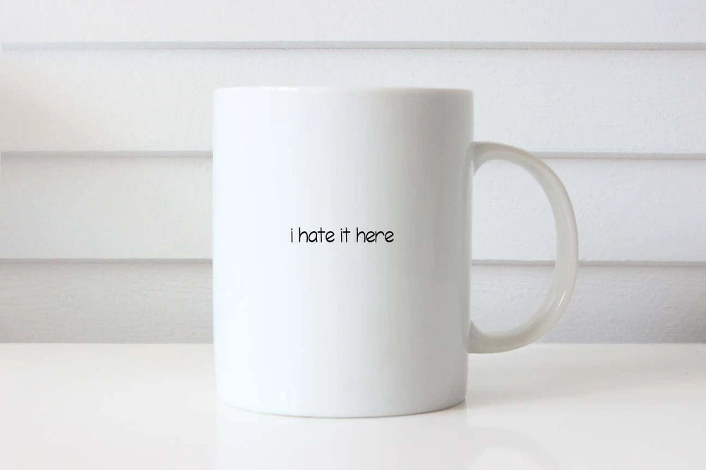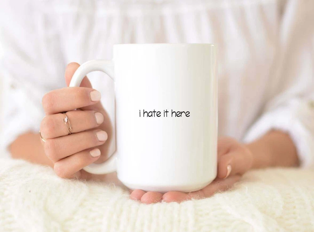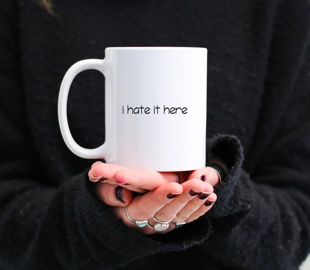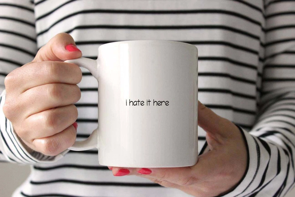 I Hate It Here Funny Coffee Mug Office Mug Work Mug Coworker Gift Product Details.. This high quality 11oz. ceramic white mug has a premium hard coat that provides crisp and vibrant color reproduction sure to last for years. Perfect for all hot & cold beverages. The highest quality printing possible is used. It will never fade no matter how many times you wash it. Material: 100% Ceramic. Print both sides. Dishwasher and Microwave Safe. High Gloss + Premium White Finish. Printed in the U.S.A. Personalized & Custom. We support personalized and custom mug to add custom, when placing an order, you can add notes to the "order note" in shipping address section. Also you can contact us directly via message. Shipping Info. Ready to ship in 1 to 2 business days, All products are made-to-order and proudly printed in the United States. Shipped by USPS and DHL, You will receive your order in 5-7 days. Replace & Refund. All products are defective during shipping broken, chipped will be replaced free of charge. You are not satisfied with the product, we will refund 100% money to you. If any other issues arise, please do not hesitate to message, we would be more than happy to assist you.