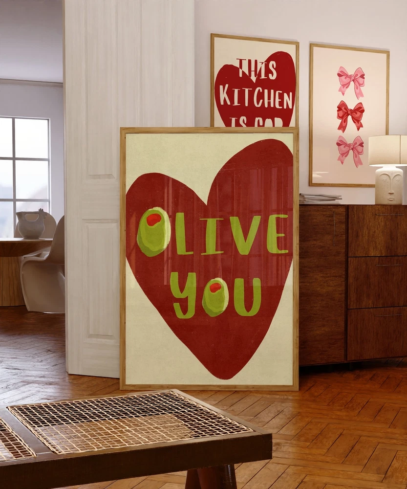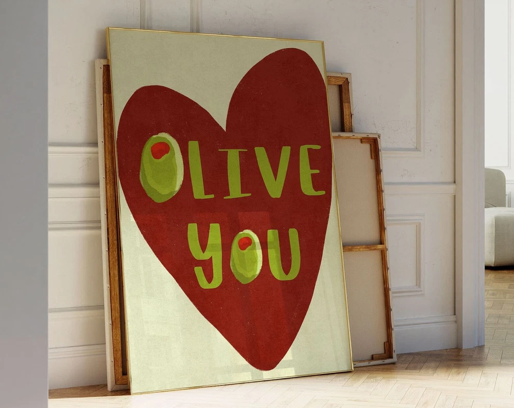 I Love You Wall Print Heart Olive Print Maximalist Kitchen Olive You Art Print Food Art Kitchen Decor Food Print Cute Olive Print Material: Premium luster photo paper Print type: Inkjet printing One side printed + The finish provides the highest possible resolution and color saturation + Lasts up to 200 years in color and 400 years in black-and-white + Printed on high-quality resin-coated photo base paper medium + Posters can be hung with double-sided tape, tacks, or framed + Hand washing with a gentle cry cloth is recommended for extended durability I will hand select the best choice of paper for your chosen design to ensure top quality results for a beautiful, bright and luxurious print. All prints are sealed in cellophane slips for protection during transportation, and are shipped in a protective cardboard envelope.