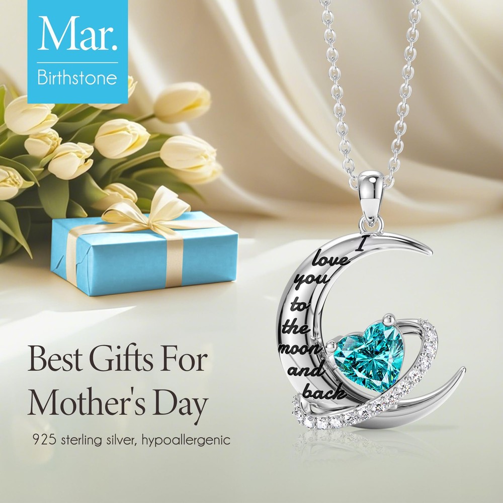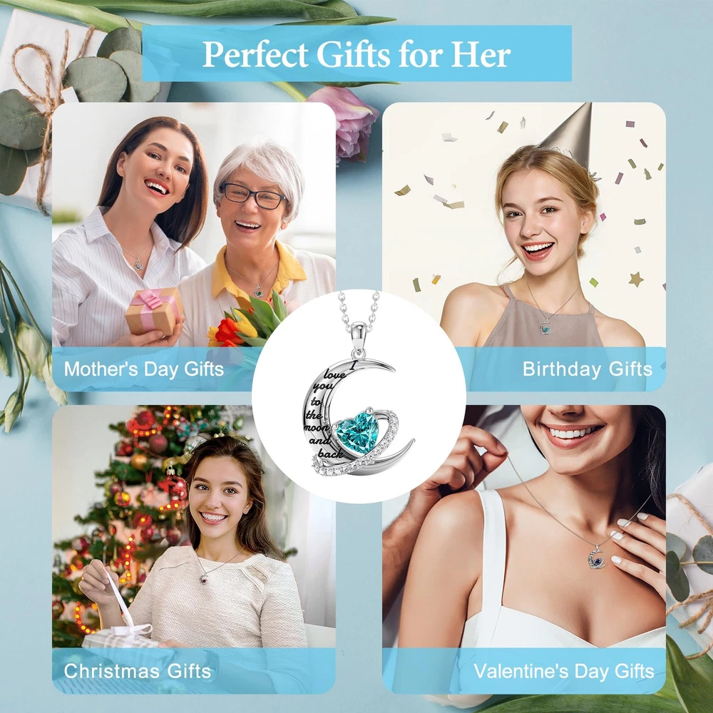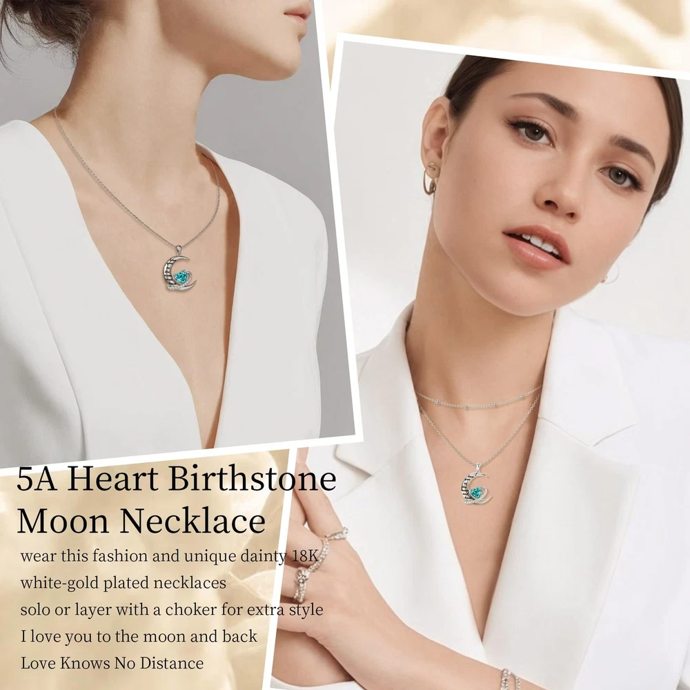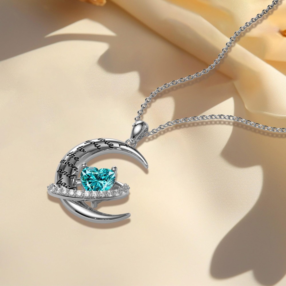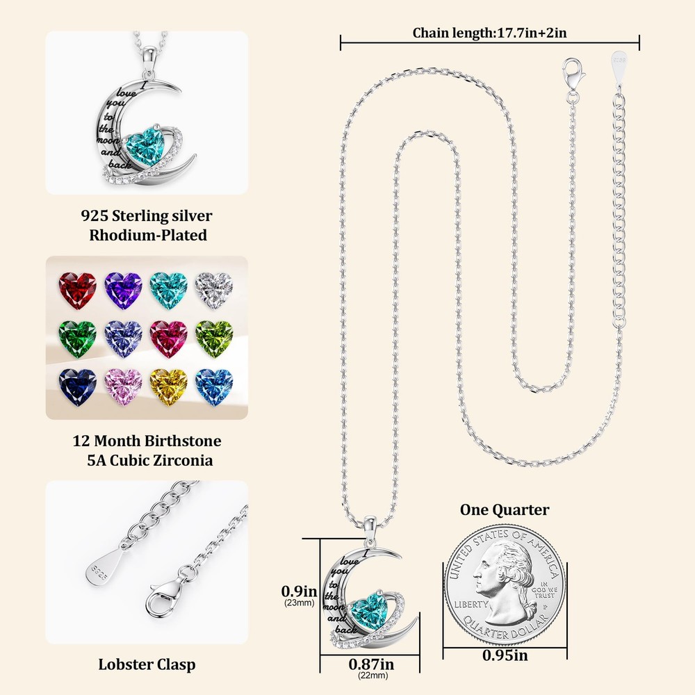 πŸ’—March-Aquamarine Blue Heart Birthstone: Crafted using 5A grade heart-shaped cubic zirconia as the birthstone, 5A grade gemstones have more facets than 3A, making the gemstone appear even more radiant and brilliant when refracting light. They possess a higher level of clarity and are often used as diamond substitutes in mid-range jewelry. Additionally, they are expertly set by professional jewelers to prevent any surface abrasion on the cubic zirconia gemstone. πŸ’ž"I Love You" β€” The heart-shaped birthstone orbits the moon like a planet, while the moon itself bears the inscription "I love you to the moon and back." This romantic expression signifies deep affection and serves as a constant reminder to the wearer that you are deserving of a lifetime of love. π‰πžπ°πžπ₯𝐫𝐲 π’π©πžπœπ’πŸπ’πœπšπ­π’π¨π§π¬: The moon necklace is crafted from 925 sterling silver with a white gold plating, nickel-free, lead-free, and hypoallergenic. chain length: 17.7in + extension chain 2in (45+5cm), weight: 6.67g. Pendant: 0.87*0.9in (22*23mm). 🎁Commemorative Gift: The birthstone moon pendant necklace comes beautifully packaged in a jewelry gift box and includes a silver polishing cloth. It's available in twelve different colors, each corresponding to a different month, allowing you to choose the birthstone color or your preferred shade. Perfect for gifting to daughters, female friends, girlfriends, wives, and mothers on occasions such as Valentine's Day, anniversaries, birthdays, and Christmas, or for any special women in your life. β™₯ 𝐏𝐞𝐫𝐟𝐞𝐜𝐭 π’πžπ«π―π’πœπž β™₯Our company is dedicated to delivering high-quality jewelry and the best customer service. If you are not satisfied, please feel free to contact us and we will do our utmost to assist you. Search for "the store" on Amazon to explore more of our designs!