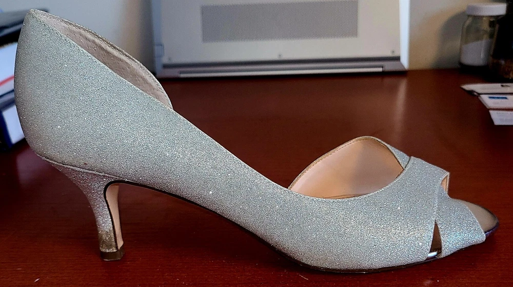 Elevate your style with these stunning I Miller peep toe pumps. These silver glitter heels feature a mid-height stiletto heel and a slip-on design, making them both fashionable and functional. The fabric upper material and peep toe design add a touch of elegance to any outfit, while the 3 inch platform height provides the perfect balance of comfort and height. Perfect for any occasion, these pumps are sure to make a statement. Get ready to shine with I Miller.