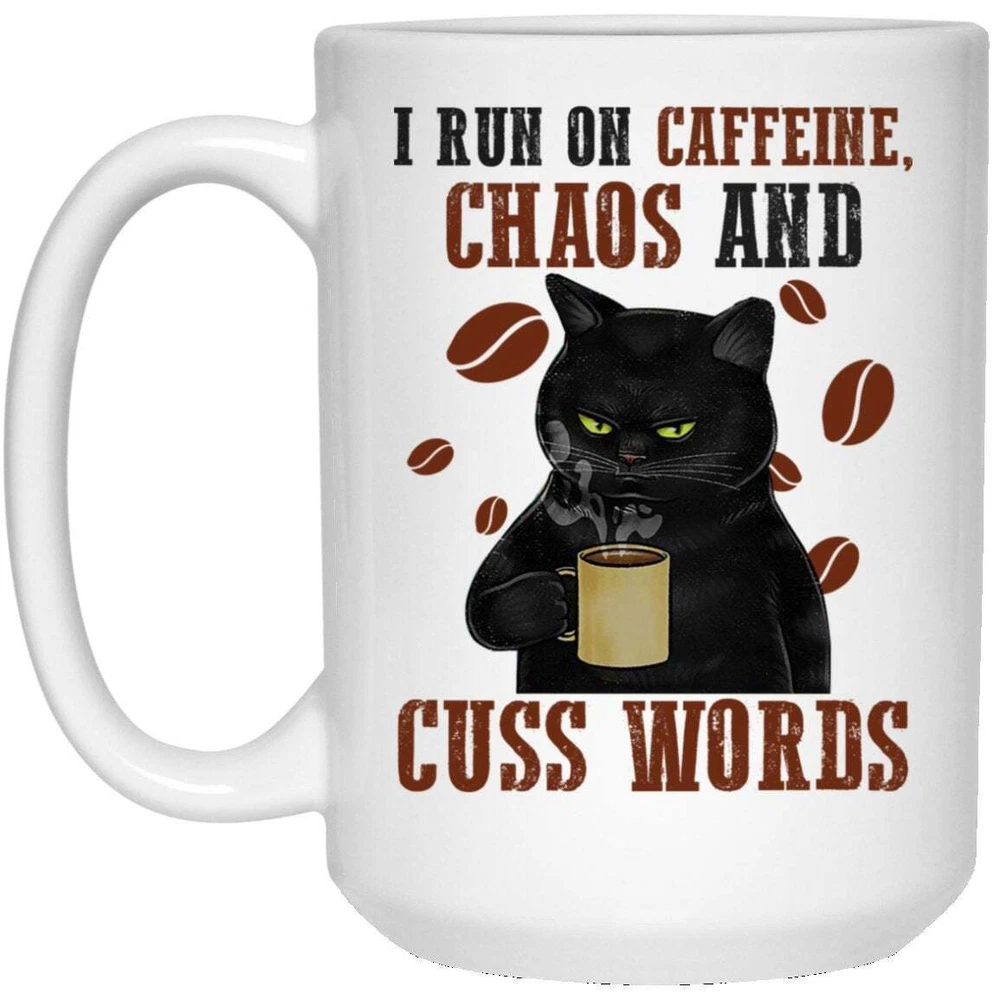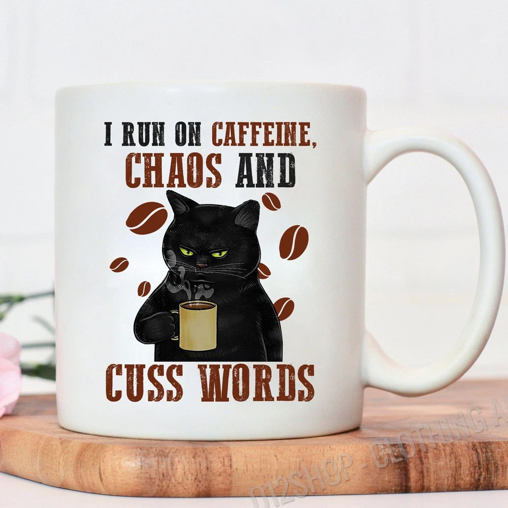 I Run On Caffeine Chaos And Cuss Words Cat Funny Mug Black Cat Mug Black Cat Product Details.. This high quality 11oz. ceramic white mug has a premium hard coat that provides crisp and vibrant color reproduction sure to last for years. Perfect for all hot & cold beverages. The highest quality printing possible is used. It will never fade no matter how many times you wash it. Material: 100% Ceramic. Print both sides. Dishwasher and Microwave Safe. High Gloss + Premium White Finish. Printed in the U.S.A. Personalized & Custom. We support personalized and custom mug to add custom, when placing an order, you can add notes to the "order note" in shipping address section. Also you can contact us directly via message. Shipping Info. Ready to ship in 1 to 2 business days, All products are made-to-order and proudly printed in the United States. Shipped by USPS and DHL, You will receive your order in 5-7 days. Replace & Refund. All products are defective during shipping broken, chipped will be replaced free of charge. You are not satisfied with the product, we will refund 100% money to you. If any other issues arise, please do not hesitate to message, we would be more than happy to assist you.