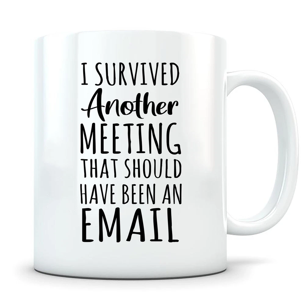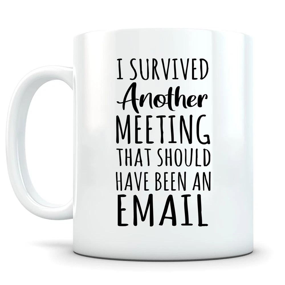 I Survived Another Meeting Mug Coworker Gag Gift Coworker Coffee Cup Funny Product Details.. This high quality 11oz. ceramic white mug has a premium hard coat that provides crisp and vibrant color reproduction sure to last for years. Perfect for all hot & cold beverages. The highest quality printing possible is used. It will never fade no matter how many times you wash it. Material: 100% Ceramic. Print both sides. Dishwasher and Microwave Safe. High Gloss + Premium White Finish. Printed in the U.S.A. Personalized & Custom. We support personalized and custom mug to add custom, when placing an order, you can add notes to the "order note" in shipping address section. Also you can contact us directly via message. Shipping Info. Ready to ship in 1 to 2 business days, All products are made-to-order and proudly printed in the United States. Shipped by USPS and DHL, You will receive your order in 5-7 days. Replace & Refund. All products are defective during shipping broken, chipped will be replaced free of charge. You are not satisfied with the product, we will refund 100% money to you. If any other issues arise, please do not hesitate to message, we would be more than happy to assist you.
