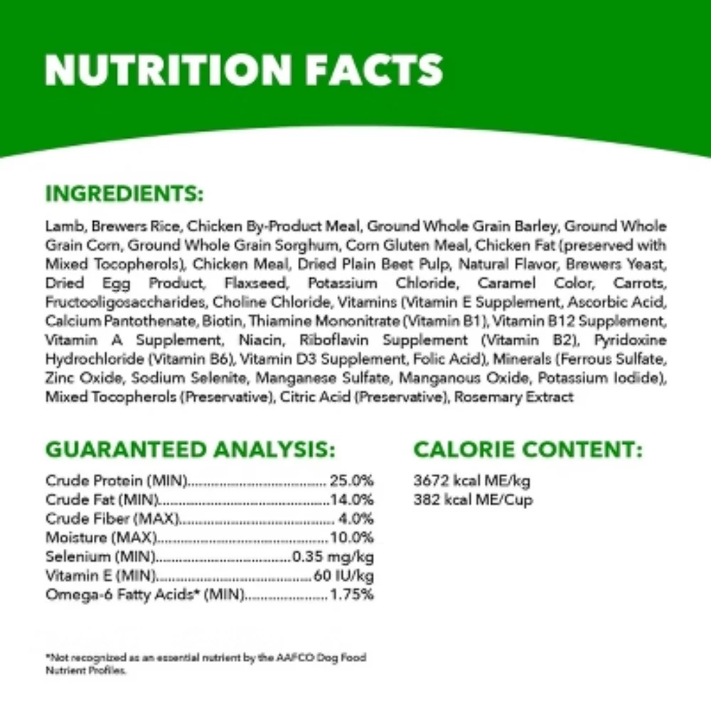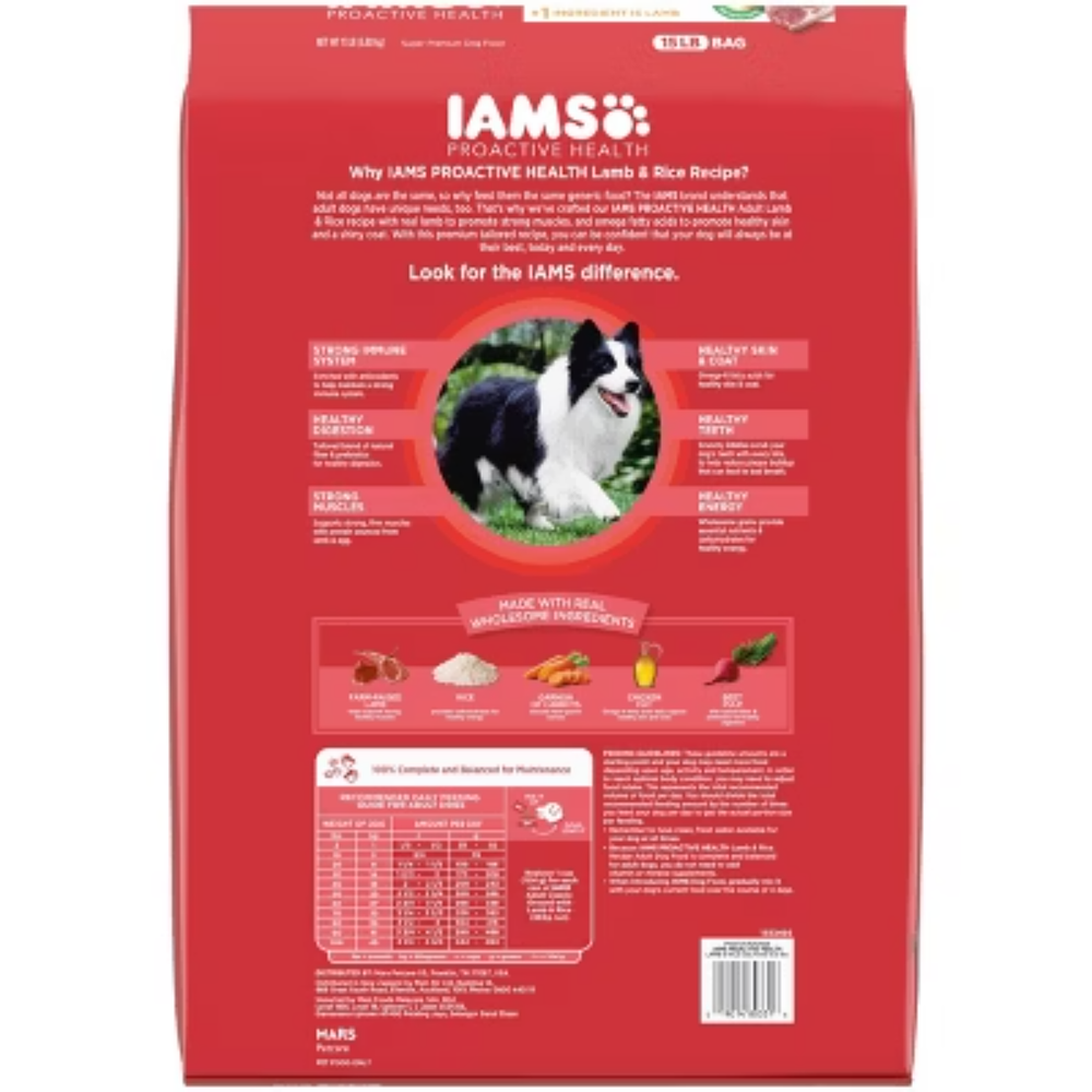 Description Your dog will come running when they hear the sound of this Lamb Meal and Rice Dry Dog Food from Iams poured into their bowl. This proactive health dog food has premium protein as the first ingredient, providing your dog with the protein they need for strong muscles. It also has a tailored fiber blend with prebiotics and beet pulp for healthy digestion, and is enriched with antioxidants for a healthy immune system. With a crunchy texture that helps reduce plaque build-up, this lamb dry dog food will satisfy your dog's taste buds while keeping them healthy. highlights Lamb and rice dry dog food helps keep your canine healthy and satisfied Features premium protein as the first ingredient for strong muscles Fiber blend of probiotics and beet pulp for healthy digestion Enriched with antioxidants for a healthy immune system Crunchy texture of the kibble helps reduce plaque buildup