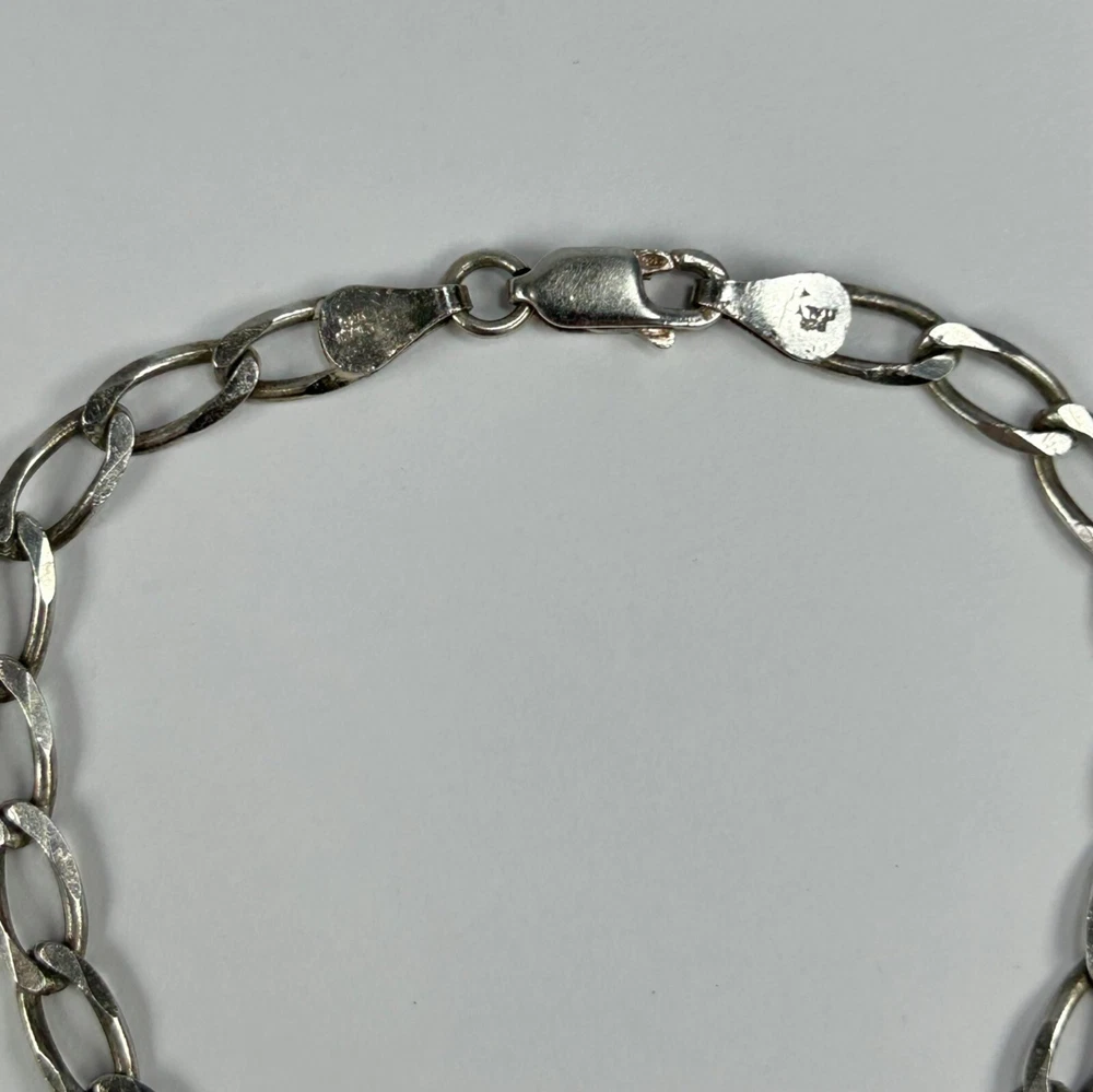 This durable and sleek sterling silver Figaro chain bracelet adds a classic touch, suitable for both everyday wear and formal occasions. • Figaro chain design • Lobster claw clasp closure • Unisex style • Lightweight and comfortable to wear anytime • MARKED IBB makers mark • Sterling Silver purity with 925 MARKED on clasp, and on both sides of loops holding the chain. Length end to end: 7.5" Made with sterling silver Made in Italy #925 #925sterlingsilver#sterlingsilverbracelet#sterlingsilver#sterlingsilverfigarochain#figarochain#925silver#figarochainbracelet#unisexsterlingsilver#unisexsterlingsilverbracelet