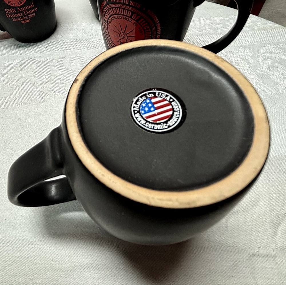 IBEW Toledo Local 8 coffee mug 2019 Dinner Dance trade union AFL CIO electrician This is a previously-owned black ceramic coffee mug with red interior, standing approximately 4 inches tall and about 3¼ inches in diameter (proportionate for a standard coffee pour). One side features the printed text: “IBEW / Toledo, Ohio / Local 8 / Est. 1891 / 55th Annual Dinner Dance / March 30, 2019.” The opposite side displays the circular emblem of the International Brotherhood of Electrical Workers, affiliated with the AFL-CIO. It is manufactured by Ceramic Source and made in the USA… IBEW Local 8, based in Toledo, Ohio and established in 1891, represents electricians across construction, maintenance, and communications trades. Affiliated with the AFL CIO, the local is known for apprenticeship training and regional project work throughout northwest Ohio and southeast Michigan, making this mug a recognizable piece of labor history tied to Toledo’s electrical workforce. Powered by SixBit's eCommerce Solution