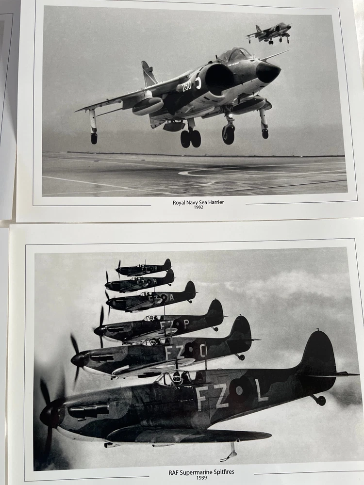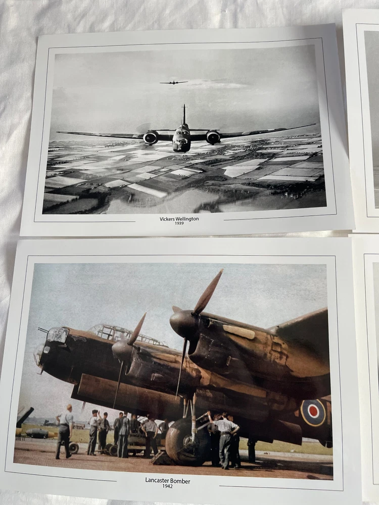 High quality professionally printed images - the item photos do not do these prints justice. Sorry about the light! Clearance stock hence the price. RRP £23.96 4 PHOTOS FEATURING: Lancaster Bomber 1942 Vickers Wellington 1939 Royal Navy Sea harrier 1982 RAF Supreme Spitfires 1939 A4 prints ( 21.0 x 29.7 cm or 8.27 x 11.69 inches) UK Postage and packaging FREE Ref: S28 Clearance