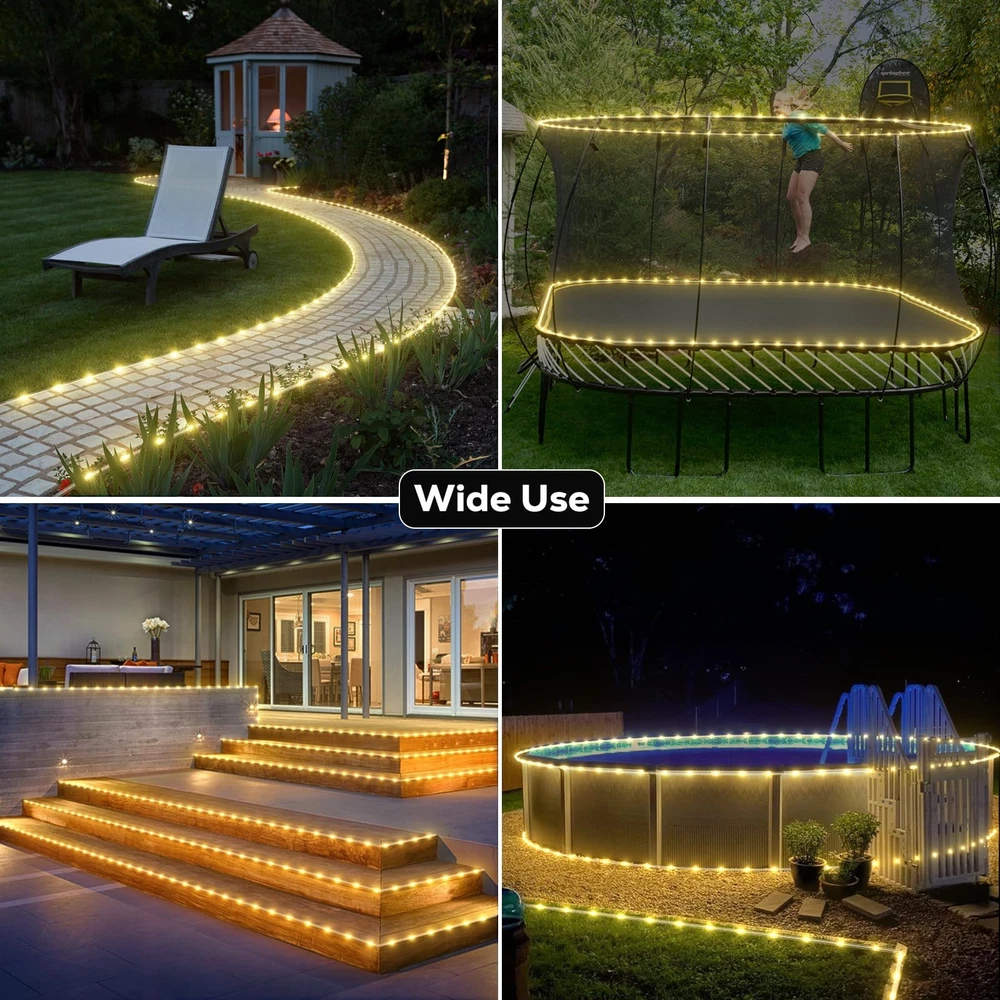 Outdoor Garden Decoration: Total 72ft / 200 led Outdoor string lights with 17 keys remote. it provides 8 light modes (1-7 are different flash modes, and mode 8 is steady on) for decorating your yard, tree, porch, fence, garden, pathway, walkway,RV; You can also adjust the brightness and use the timer function. Please note: this light contains 66ft rope lights + 6.6ft extension cord Upgrade Solar String Lights - Total 72ft / 200 led Outdoor string lights with 17 keys remote. it provide 8 light modes (1-7 are different flash modes, mode 8 is steady on), Adjust the brightness; Timer function. Total 72ft: 66ft string lights + 6.6ft traction line Energy Saving & Environmental Protection- High-quality solar power, effective energy saving. It built-in 1200mah rechargeable battery, solar panel charging during the day, light auto turns on at dusk, 20h runtime when fully charged. Tips: Please do not remove the protective film on the solar panel to avoid shortening the life of the solar panel. Memory Function & Timing Function: This solar light has memory function, you just need set one time, they stay set until you adjust them again. Timer function - 3H/5H/8H. Longer Life & More Safe - Our solar light is completely covered by a transparent PVC tube, it is durable and flexible, you could DIY the solar lights into any shape you want. It's also much safer for Kids and pets compared with ordinary copper wire string lights Christmas Decoration & IP67 Waterproof - This rope light is IP67 waterproof, you could use this it in sun/ wind /rain/snow/ fog and any weather. It's a good choice for Indoor & outdoor decorations, and fit special events like party, Xmas, Halloween, Thanksgiving, wedding, birthday, Valentine’s day, etc Package: 1* string light, 1* solar panel, 1* remote control, 1* user manual, 10* zip ties. Any questions please contact us.
