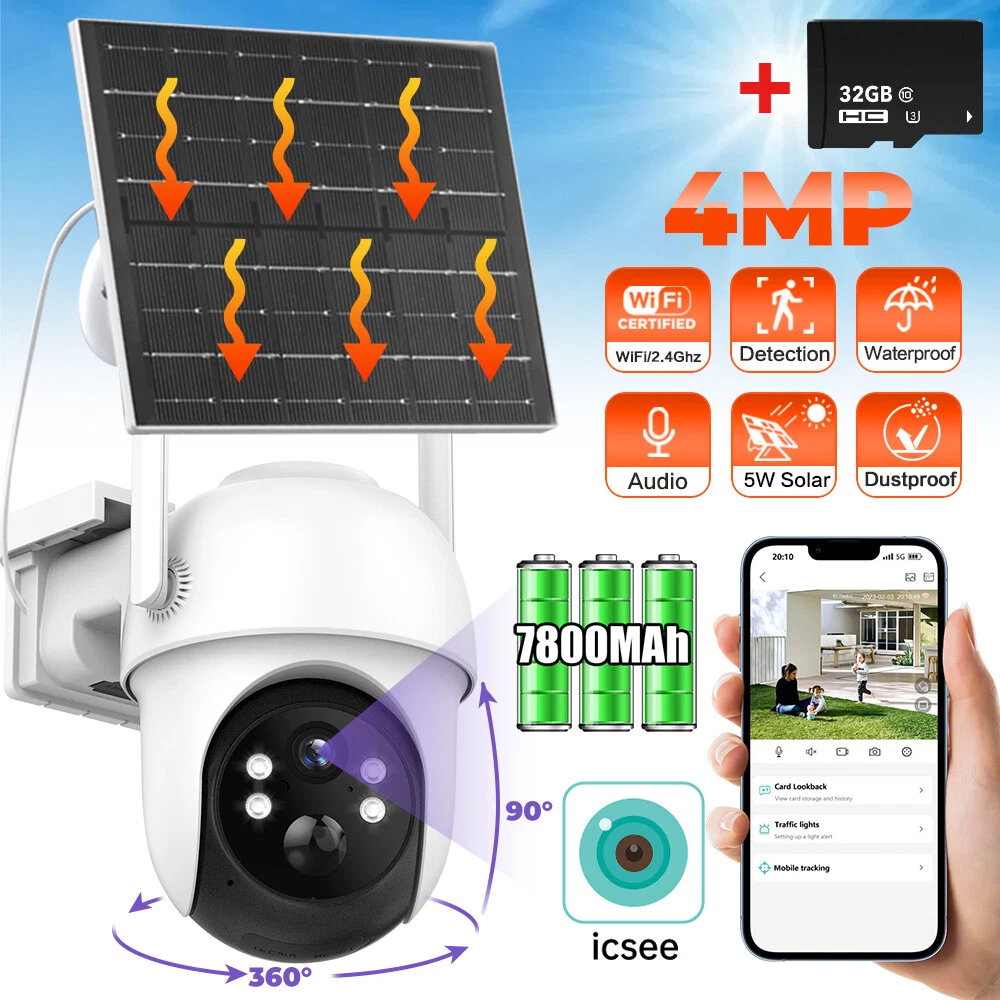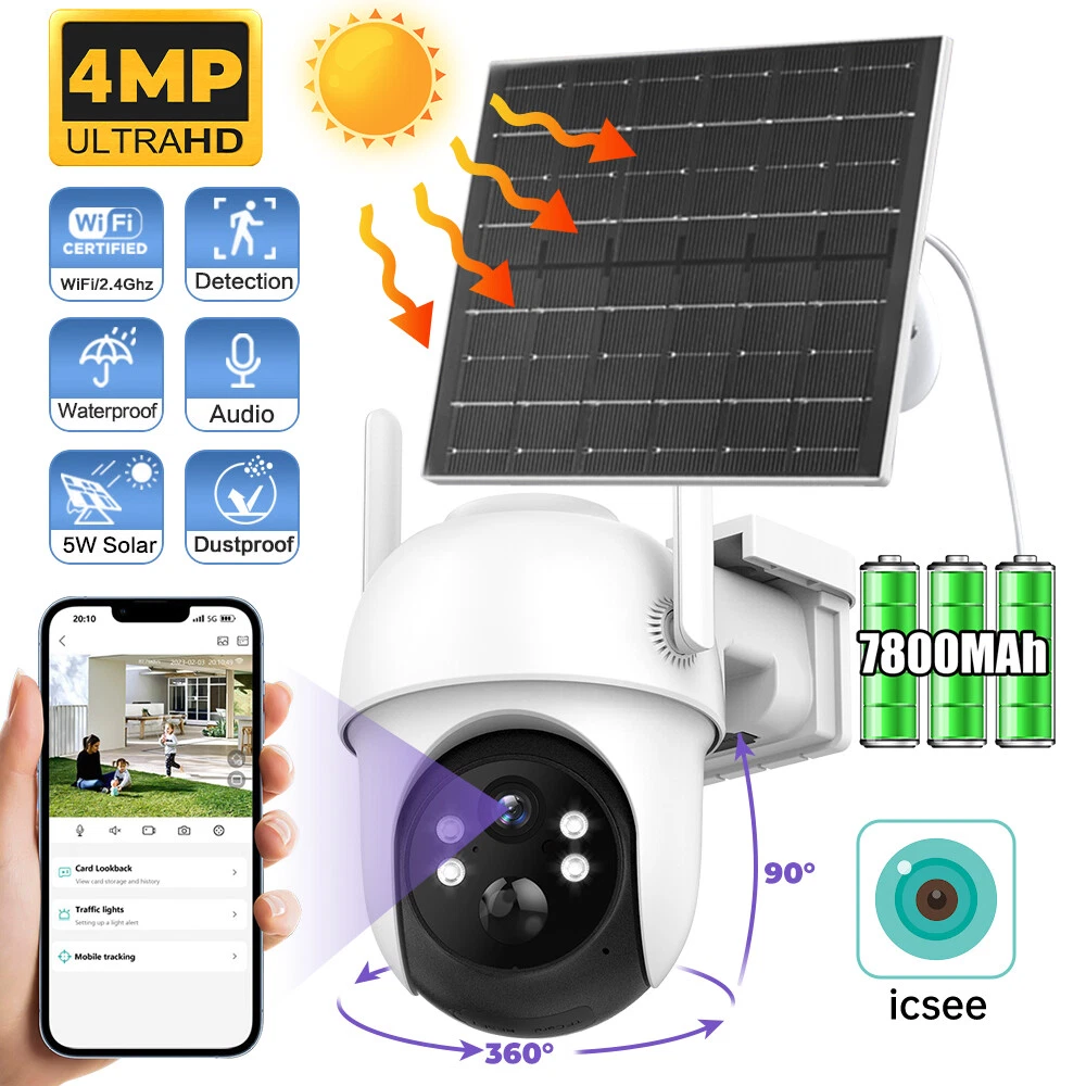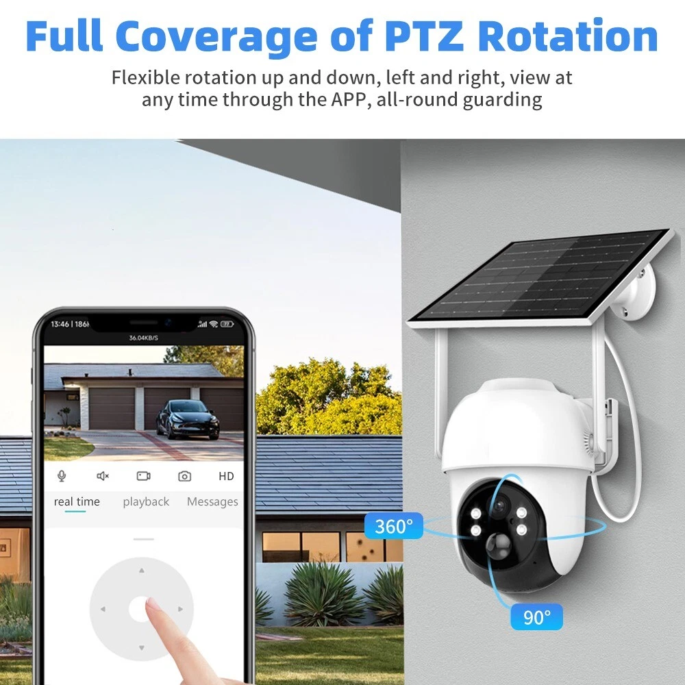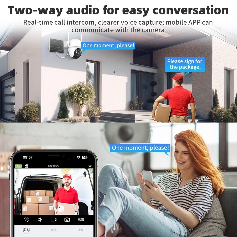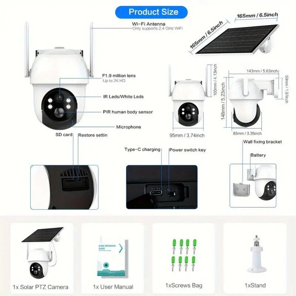 (Only support 2.4GHz WiFi, not support 5GHz WiF) Wired-Free & Solar/Battery Powered No electrical wiring jobs. It comes with built-in rechargeable batteries of 7800mAh and gets non-stop power by the 5W solar panel kit included. Smart Alarm and Spotlights Alarm Unique Smart Siren Alarm feature work with Spotlights is really an awesome design when it detects unexpected visitors at night in darkness and derters them off your place right away. PIR Alarm & Motion Detection The camera has PIR human body infrared detection. When the camera detects motion, it will send you a message in time to remind you what happened Color Night Vision & 360° View Take a panoramic shooting and mak e sure no blind spots or zone,and get great video quality. Great IR night vision in darkness as well as Color night vision enabled by 2 powerful spotlights. PTZ Function & SD card & Cloud stroage The Camera support 355°horizontal ,90°vertical rotation and 4x zoom, with more areas that can be covered. The camera supports Micro SD card (up to 128GB, not included) and cloud storage (montly fee) Cover Every Corner with pan tilt The security camera is designed with the rotation of a vertical 90 degrees and a horizontal 355 degrees; You can remote control the security camera to monitor all-round without blind spots. Two-way Audio Built-in microphone & speaker, you can see, hear and talk to anyone who appears on the screen of your device even though you are thousands of miles away. PIR Motion Sensor & Real-Time Alert The security camera has PIR human body infrared detection, which can effectively reduce false alarms caused by insect pests, leaves, rain and snow, etc. Clear 2K FHD Video Ideal for home or business 4MP offers exceptional Full HD resolution and quality enhancing efficiency and monitoring capabilities. Multiple Deterrences If the camera detects humanoid movements, the system will send out an alarm (Show message to APP, Send email, system buzzer). You can know that someone is approaching your home anytime, anywhere.