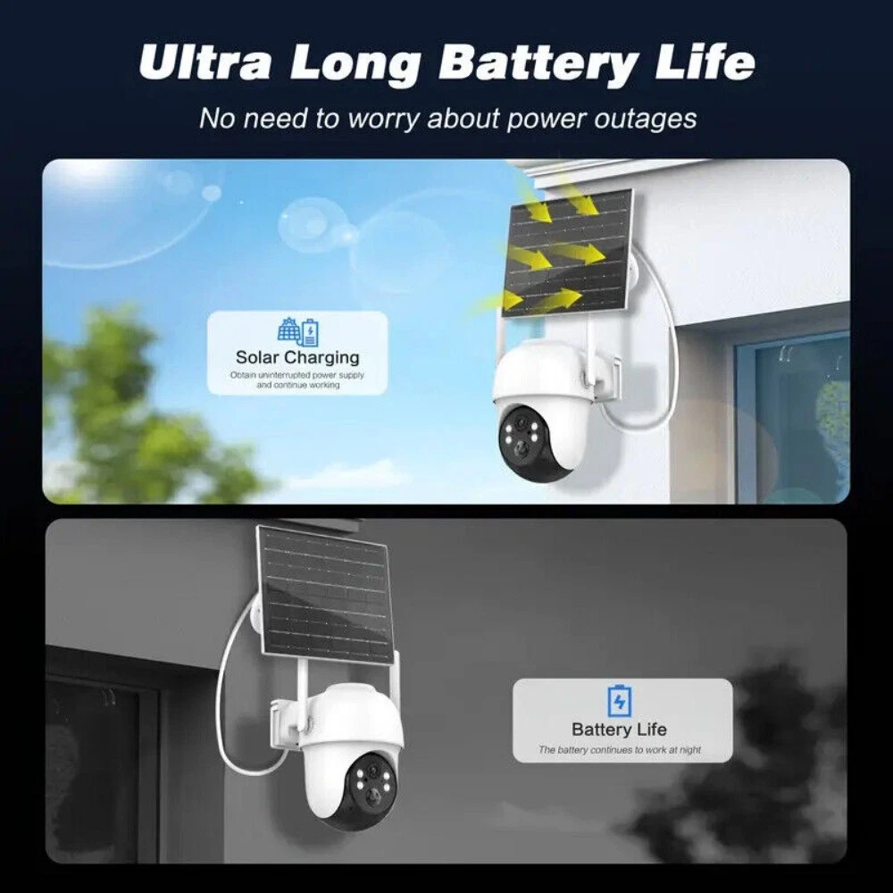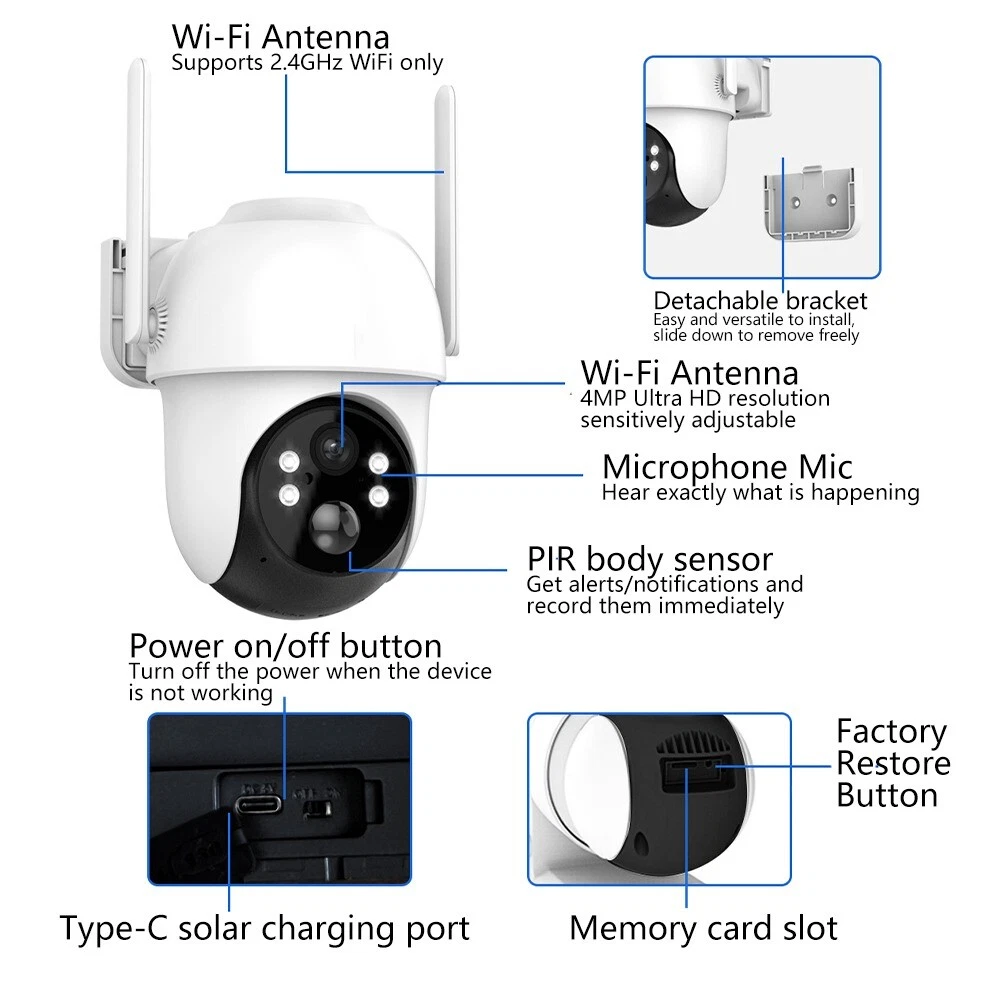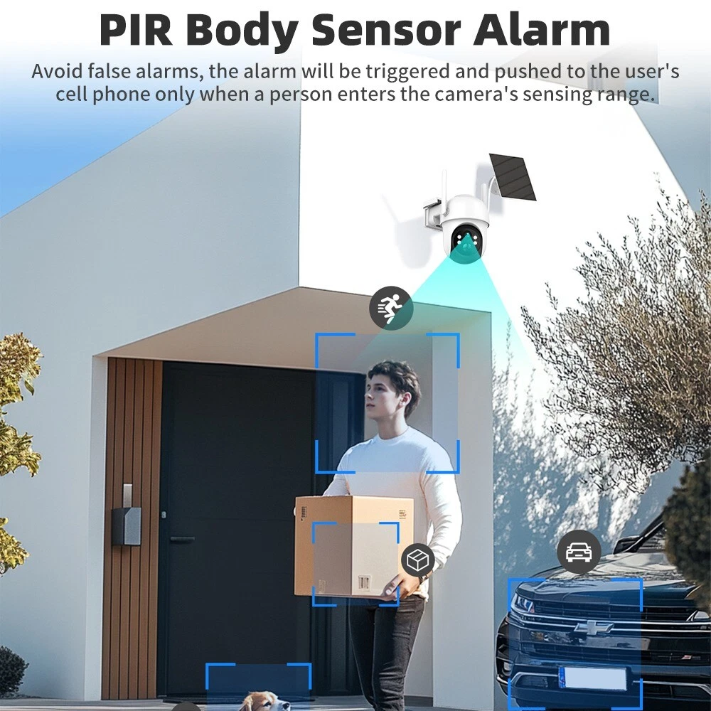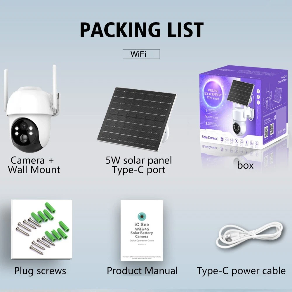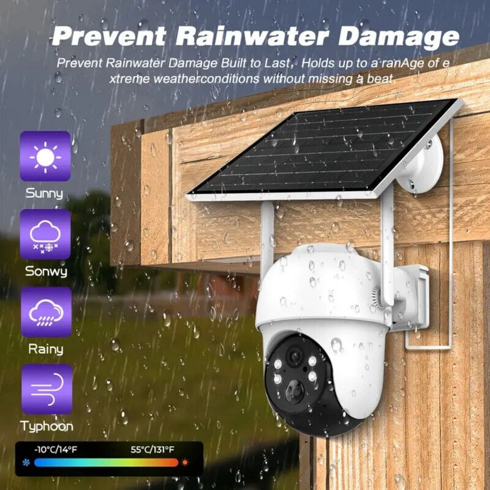 (Only support 2.4GHz WiFi, not support 5GHz WiF) Wired-Free & Solar/Battery Powered No electrical wiring jobs. It comes with built-in rechargeable batteries of 7800mAh and gets non-stop power by the 5W solar panel kit included. Smart Alarm and Spotlights Alarm Unique Smart Siren Alarm feature work with Spotlights is really an awesome design when it detects unexpected visitors at night in darkness and derters them off your place right away. PIR Alarm & Motion Detection The camera has PIR human body infrared detection. When the camera detects motion, it will send you a message in time to remind you what happened Color Night Vision & 360° View Take a panoramic shooting and mak e sure no blind spots or zone,and get great video quality. Great IR night vision in darkness as well as Color night vision enabled by 2 powerful spotlights. PTZ Function & SD card & Cloud stroage The Camera support 355°horizontal ,90°vertical rotation and 4x zoom, with more areas that can be covered. The camera supports Micro SD card (up to 128GB, not included) and cloud storage (montly fee) Cover Every Corner with pan tilt The security camera is designed with the rotation of a vertical 90 degrees and a horizontal 355 degrees; You can remote control the security camera to monitor all-round without blind spots. Two-way Audio Built-in microphone & speaker, you can see, hear and talk to anyone who appears on the screen of your device even though you are thousands of miles away. PIR Motion Sensor & Real-Time Alert The security camera has PIR human body infrared detection, which can effectively reduce false alarms caused by insect pests, leaves, rain and snow, etc. Clear 2K FHD Video Ideal for home or business 4MP offers exceptional Full HD resolution and quality enhancing efficiency and monitoring capabilities. Multiple Deterrences If the camera detects humanoid movements, the system will send out an alarm (Show message to APP, Send email, system buzzer). You can know that someone is approaching your home anytime, anywhere.