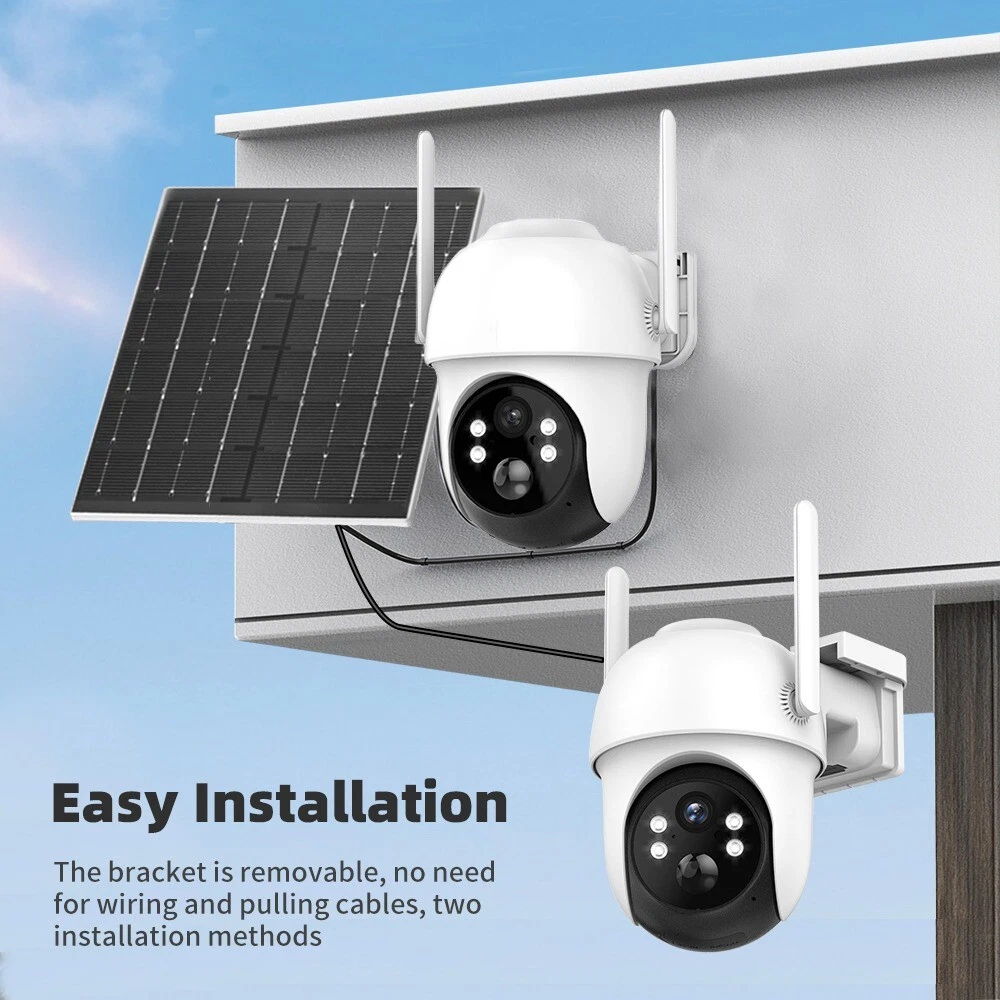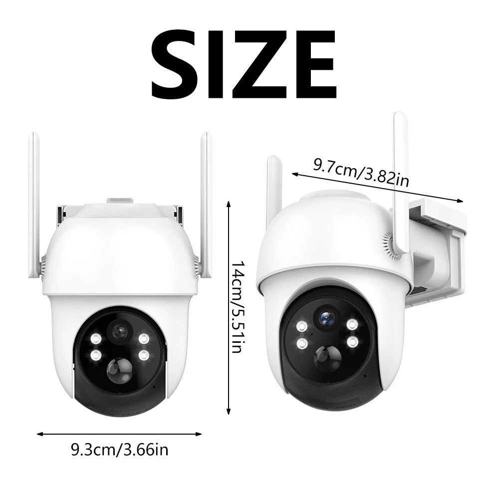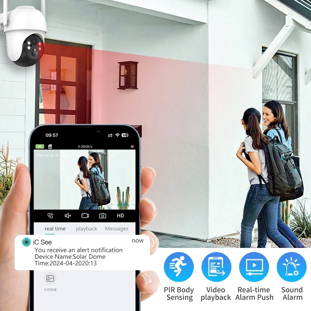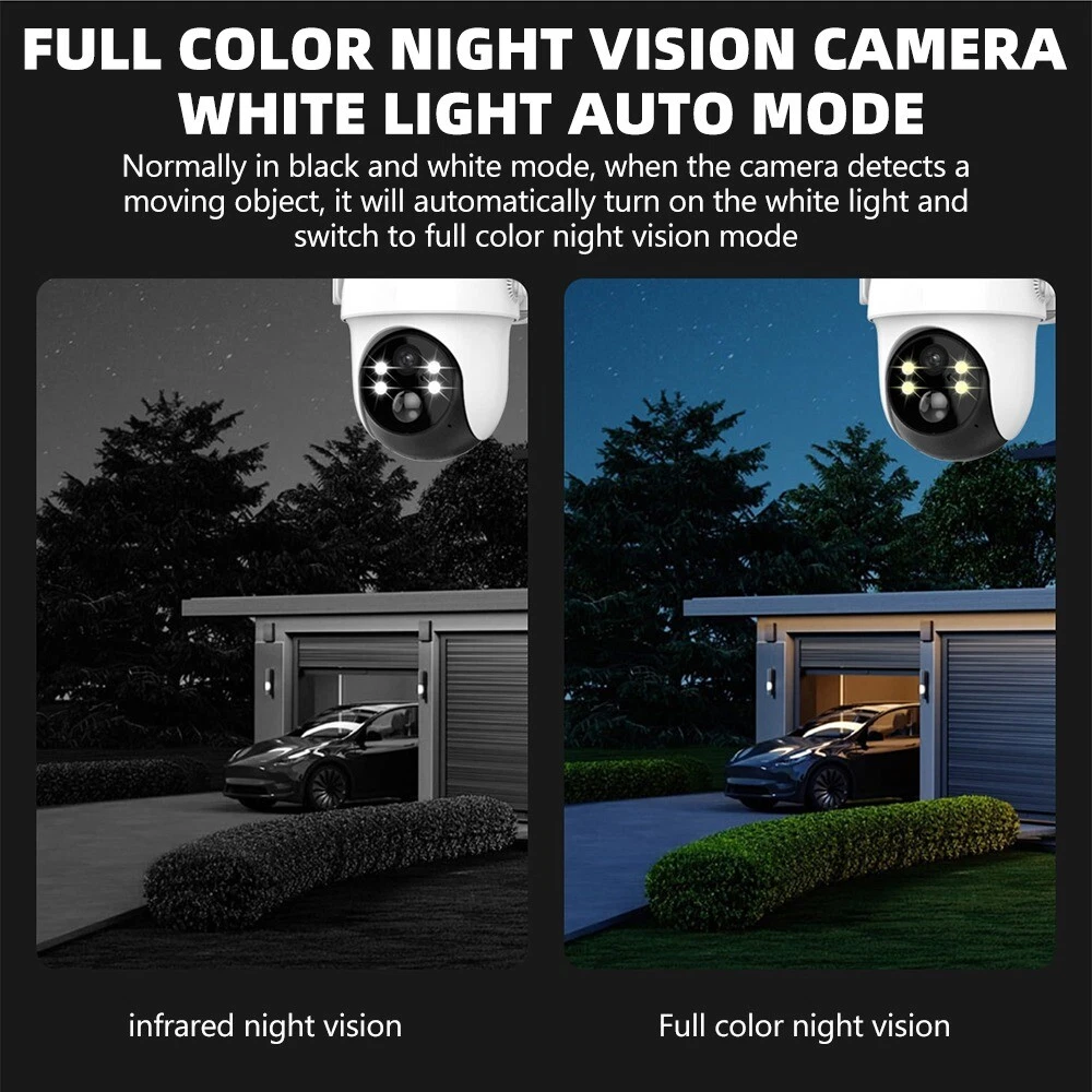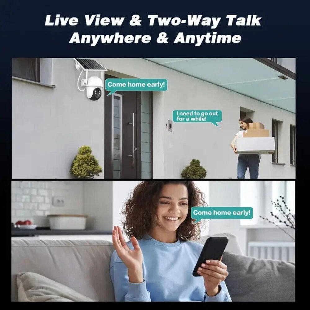 (Only support 2.4GHz WiFi, not support 5GHz WiF) Wired-Free & Solar/Battery Powered No electrical wiring jobs. It comes with built-in rechargeable batteries of 7800mAh and gets non-stop power by the 5W solar panel kit included. Smart Alarm and Spotlights Alarm Unique Smart Siren Alarm feature work with Spotlights is really an awesome design when it detects unexpected visitors at night in darkness and derters them off your place right away. PIR Alarm & Motion Detection The camera has PIR human body infrared detection. When the camera detects motion, it will send you a message in time to remind you what happened Color Night Vision & 360° View Take a panoramic shooting and mak e sure no blind spots or zone,and get great video quality. Great IR night vision in darkness as well as Color night vision enabled by 2 powerful spotlights. PTZ Function & SD card & Cloud stroage The Camera support 355°horizontal ,90°vertical rotation and 4x zoom, with more areas that can be covered. The camera supports Micro SD card (up to 128GB, not included) and cloud storage (montly fee) Cover Every Corner with pan tilt The security camera is designed with the rotation of a vertical 90 degrees and a horizontal 355 degrees; You can remote control the security camera to monitor all-round without blind spots. Two-way Audio Built-in microphone & speaker, you can see, hear and talk to anyone who appears on the screen of your device even though you are thousands of miles away. PIR Motion Sensor & Real-Time Alert The security camera has PIR human body infrared detection, which can effectively reduce false alarms caused by insect pests, leaves, rain and snow, etc. Clear 2K FHD Video Ideal for home or business 4MP offers exceptional Full HD resolution and quality enhancing efficiency and monitoring capabilities. Multiple Deterrences If the camera detects humanoid movements, the system will send out an alarm (Show message to APP, Send email, system buzzer). You can know that someone is approaching your home anytime, anywhere.