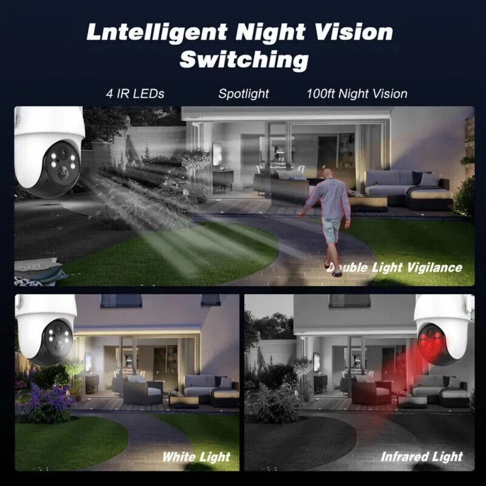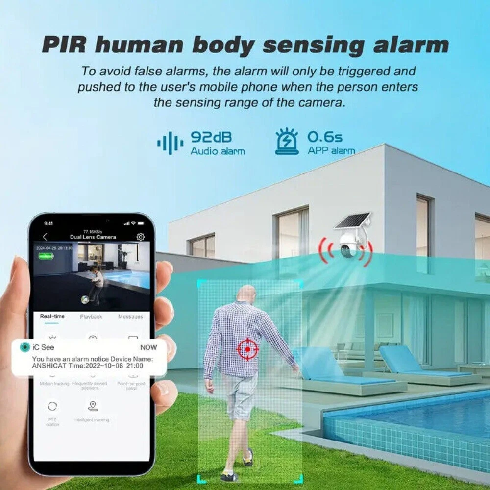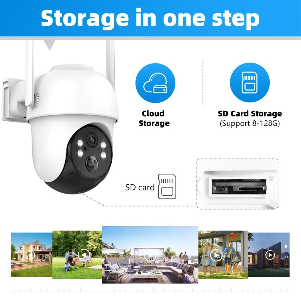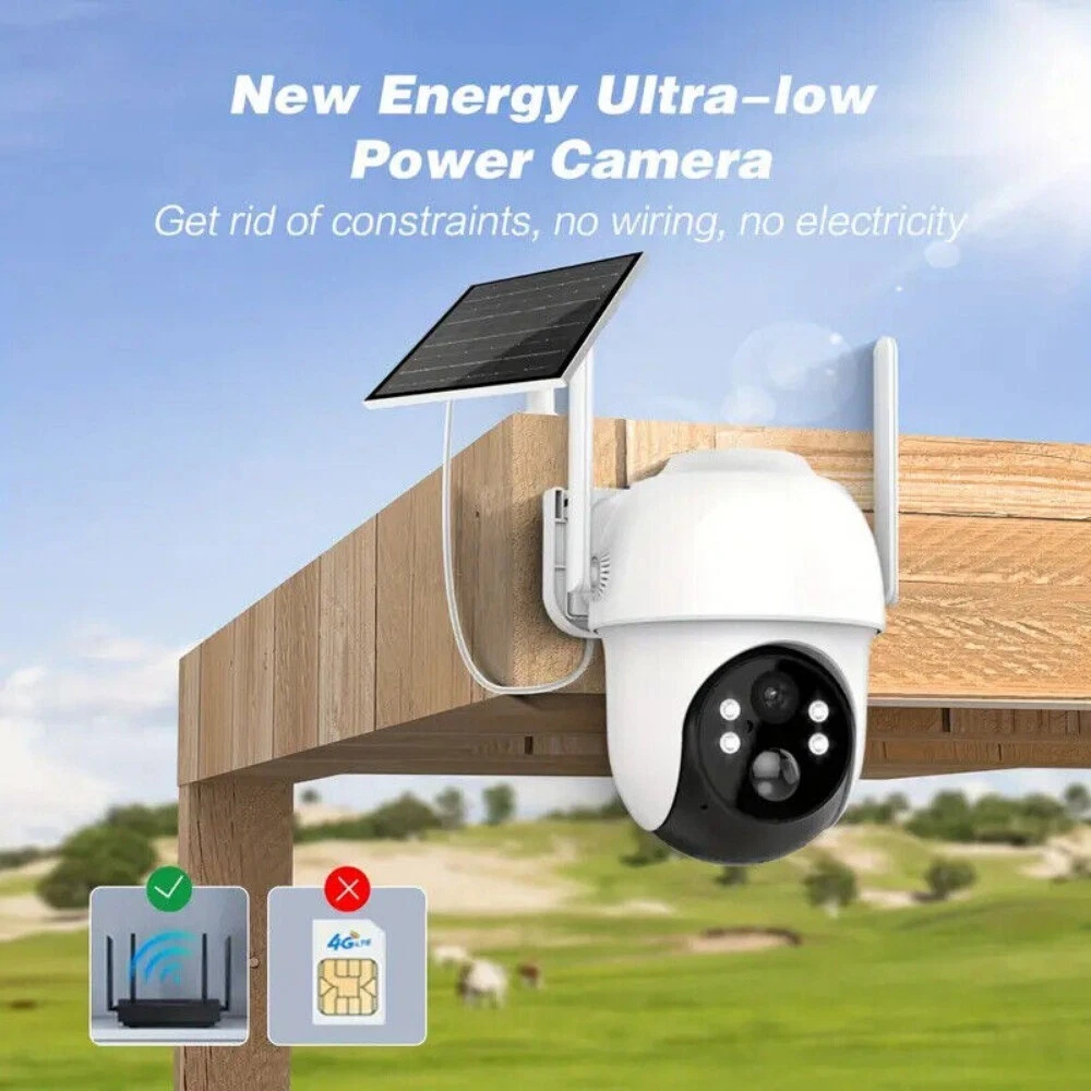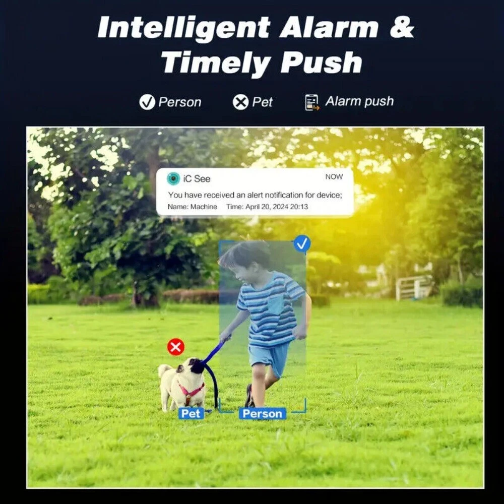 (Only support 2.4GHz WiFi, not support 5GHz WiF) Wired-Free & Solar/Battery Powered No electrical wiring jobs. It comes with built-in rechargeable batteries of 7800mAh and gets non-stop power by the 5W solar panel kit included. Smart Alarm and Spotlights Alarm Unique Smart Siren Alarm feature work with Spotlights is really an awesome design when it detects unexpected visitors at night in darkness and derters them off your place right away. PIR Alarm & Motion Detection The camera has PIR human body infrared detection. When the camera detects motion, it will send you a message in time to remind you what happened Color Night Vision & 360° View Take a panoramic shooting and mak e sure no blind spots or zone,and get great video quality. Great IR night vision in darkness as well as Color night vision enabled by 2 powerful spotlights. PTZ Function & SD card & Cloud stroage The Camera support 355°horizontal ,90°vertical rotation and 4x zoom, with more areas that can be covered. The camera supports Micro SD card (up to 128GB, not included) and cloud storage (montly fee) Cover Every Corner with pan tilt The security camera is designed with the rotation of a vertical 90 degrees and a horizontal 355 degrees; You can remote control the security camera to monitor all-round without blind spots. Two-way Audio Built-in microphone & speaker, you can see, hear and talk to anyone who appears on the screen of your device even though you are thousands of miles away. PIR Motion Sensor & Real-Time Alert The security camera has PIR human body infrared detection, which can effectively reduce false alarms caused by insect pests, leaves, rain and snow, etc. Clear 2K FHD Video Ideal for home or business 4MP offers exceptional Full HD resolution and quality enhancing efficiency and monitoring capabilities. Multiple Deterrences If the camera detects humanoid movements, the system will send out an alarm (Show message to APP, Send email, system buzzer). You can know that someone is approaching your home anytime, anywhere.
