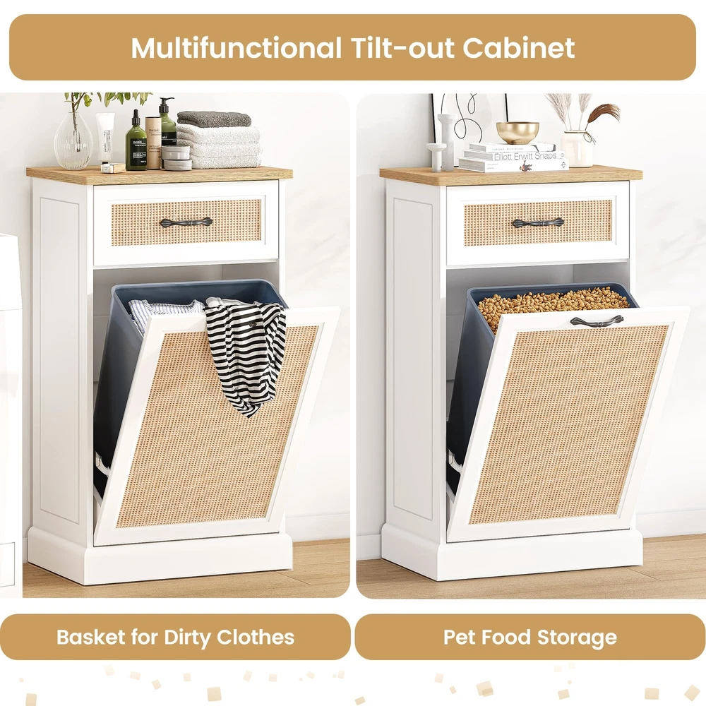 Stylish and Hidden Design:The rattan trash can cabinet is designed to cleverly hide garbage and waste, keep the kitchen or living space clean and orderly, with an aesthetic and decorative effect. And this freestanding pet-proof garbage can cabinet has no top lid, effectively preventing pets from entering the trash can and reducing the risk of accidental spills. (Pet friendly trash can) Convenient Garbage Disposal: The inclined opening design makes garbage disposal easy and simple. Just gently tilt the front panel for quick access and disposal, eliminating the hassle of moving heavy bags or buckets. Additional pull-out drawers and compartments provide additional storage space for easy sorting, recycling and storage of cleaning supplies. Sturdy and Freestanding Cabinet: The bottom and sides of our bins are reinforced to withstand up to 50 pounds of garbage for stability. It can be seamlessly integrated into a kitchen or utility room layout, providing dedicated waste storage space without taking up valuable floor or countertop space. Multifunctional Storage Solution: The 10-gallon cabinet can be used not only for trash storage, but also for pet food storage, laundry baskets, children's toys storage, and even as a kitchen island. Easy to clean, easy to take care of after each use, keep your garbage cabinet clean and tidy. Easy Assembly and Quality Service: All parts and tools for the tilt-out trash can cabinet are clearly marked in the manual, with clear assembly instructions suitable for anyone with no prior assembly experience. Whether you have questions before or after your purchase, please feel free to contact us, and we will provide you with 24/7 professional customer service.