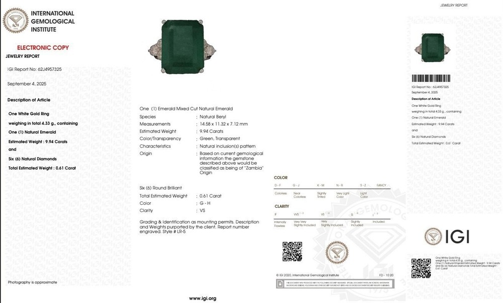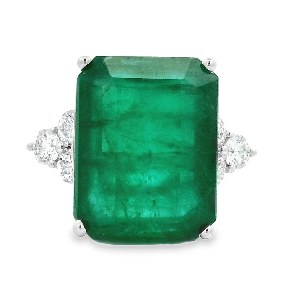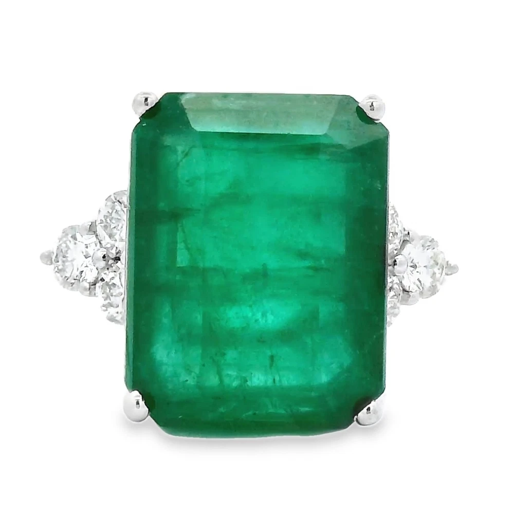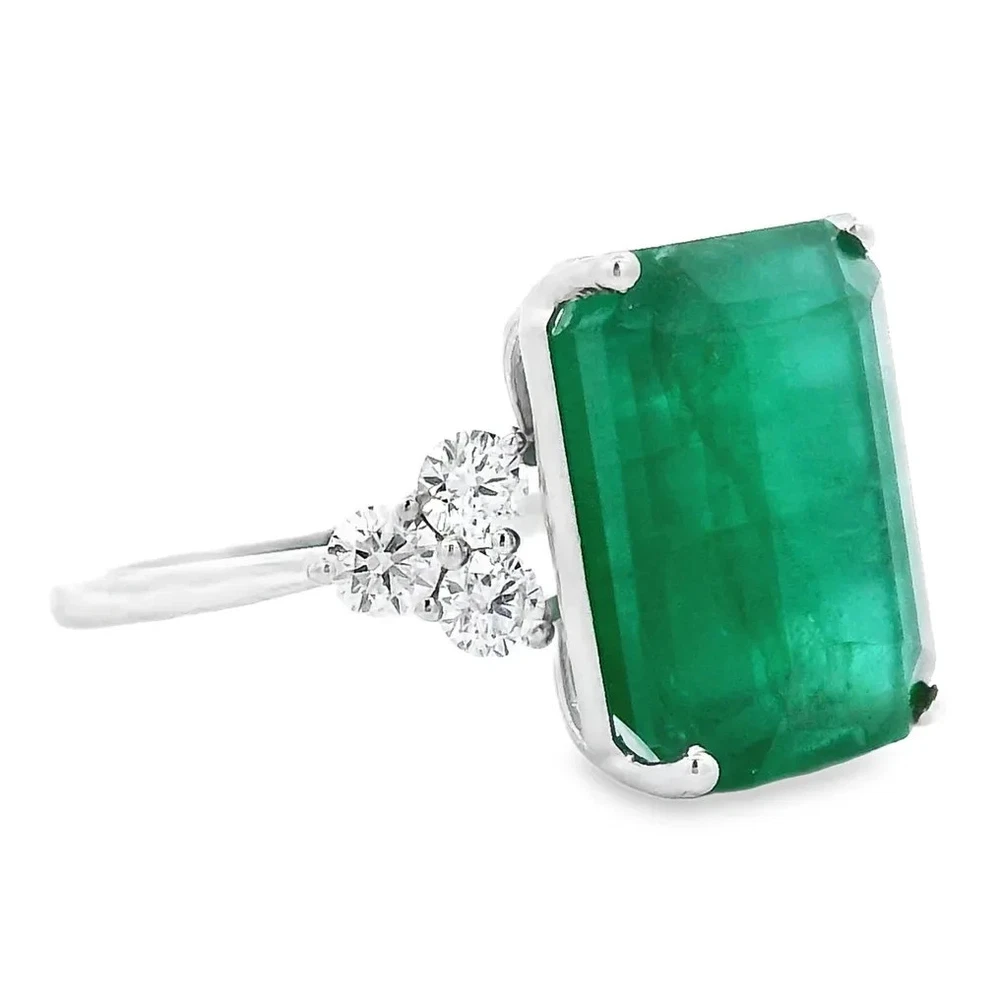 Type: Ring Sizable: Yes Occasion: Anniversary, Birthday, Christening, Christmas, Confirmation/Communion, Engagement, Mother's Day, Valentine's Day, Wedding Brand: Shriharigemsjewels Main Stone: Emerald Main Stone Shape: Emerald Cut Grade: Excellent Secondary Stone: Diamond Main Stone Width: 11.32mm Country of Origin: Zambia Ring Size: 6.75 Number of Gemstones: 1 Metal: White Gold Base Metal: Gold Main Stone Creation: Natural Main Stone Length: 14.58mm Main Stone Color: Green Certification: IGI Diamond Clarity Grade: VS1, VS2 Main Stone Depth: 7.12mm Diamond Color Grade: G-H Metal Purity: 14k Total Carat Weight: 10.55 Number of Diamonds: 6