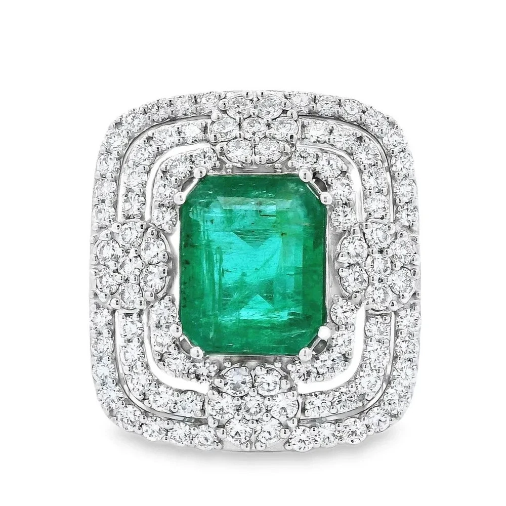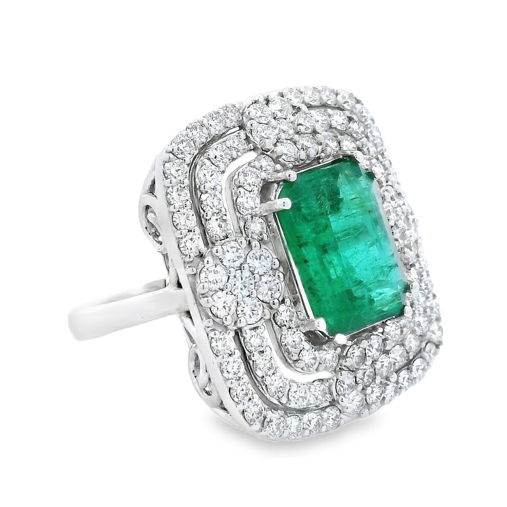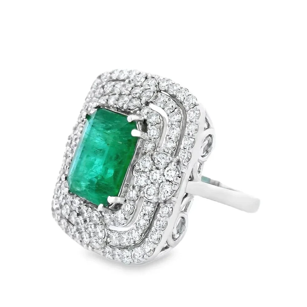 A Beautiful Emerald cut Emerald ring. 6.75 US / 14 IT / 54 EU **Ring size can be adjusted for free Comes With authenticity report from IGI (report number engraved on the inner side of ring) Total Carat - 5.08 Carat Centre Stone - Emerald, Centre Stone Weight - 3.38 Carat, Centre Stone Transparency - Transparent IGI Report Number- 57J5171725 Total Number of Diamonds - 96 , Diamonds Carat Weight - 1.70 carat Diamond Shape and Cut - Round Brilliant Cut, Diamond Color & Clarity - H/I VS/SI Diamonds Set in 14K White Gold , 9.21 Grams gross weight, Ring Size - 6.75 US, 14 IT, 54 EU