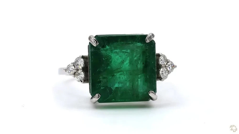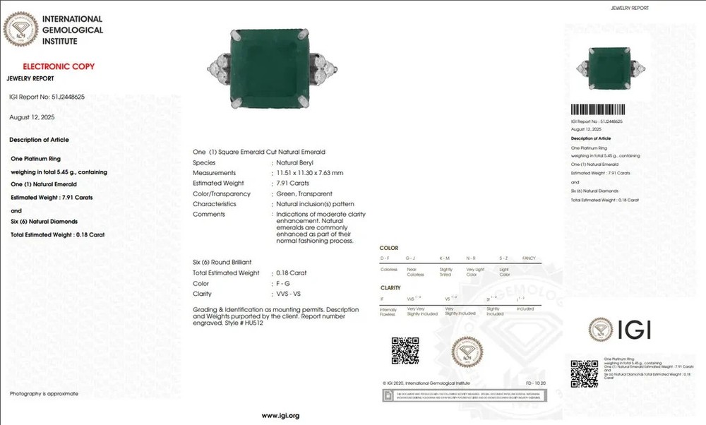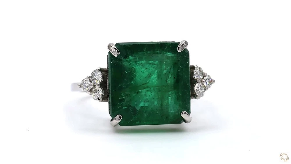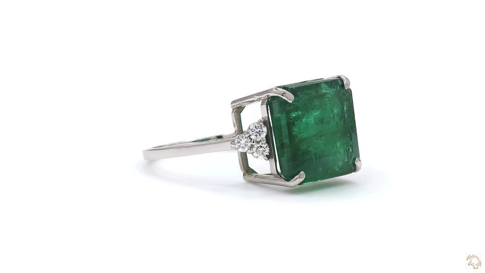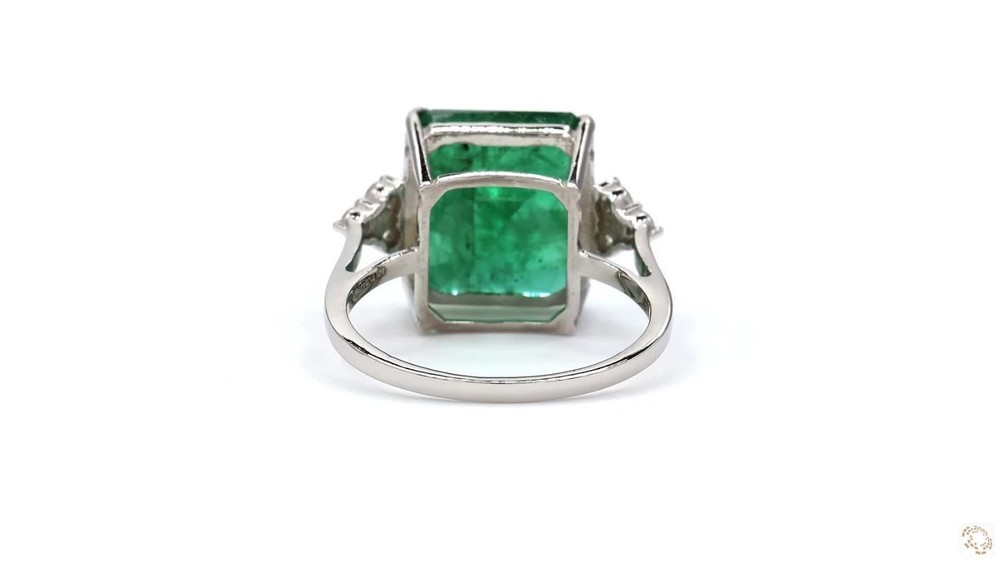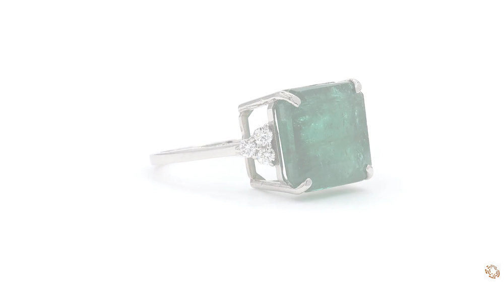 Total Carat - 8.09 Ct Color - Green , Transparent A Beautiful Square Emerald cut Emerald ring. Comes With authenticity report from IGI (report number engraved on the inner side of ring) Centre Stone - Emerald, Centre Stone Weight - 7.91 Carat, Centre Stone Color - Green Centre Stone Transparency - Transparent IGI Report Number- 51J2448625 Total Number of Diamonds - 6, Diamonds Carat Weight - 0.18 carat Diamond Shape and Cut - Round Brilliant Cut, Diamond Color & Clarity - F/G VVS Diamonds FG is color of diamonds VVS means very very slight inclusion not visible to unaided eye Set in Platinum950 , 5.45 Grams gross weight, Ring Size - 6.75 US / 14 IT / 54 EU