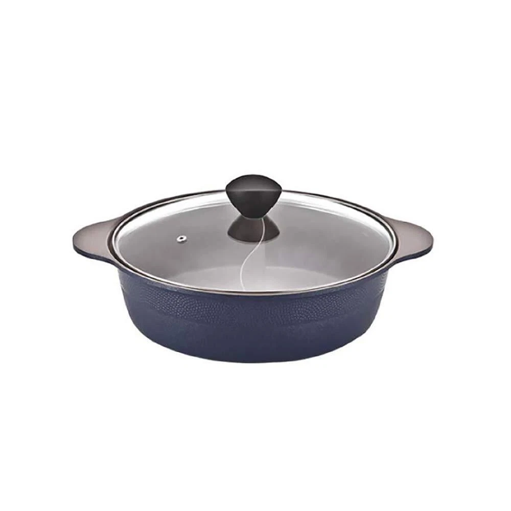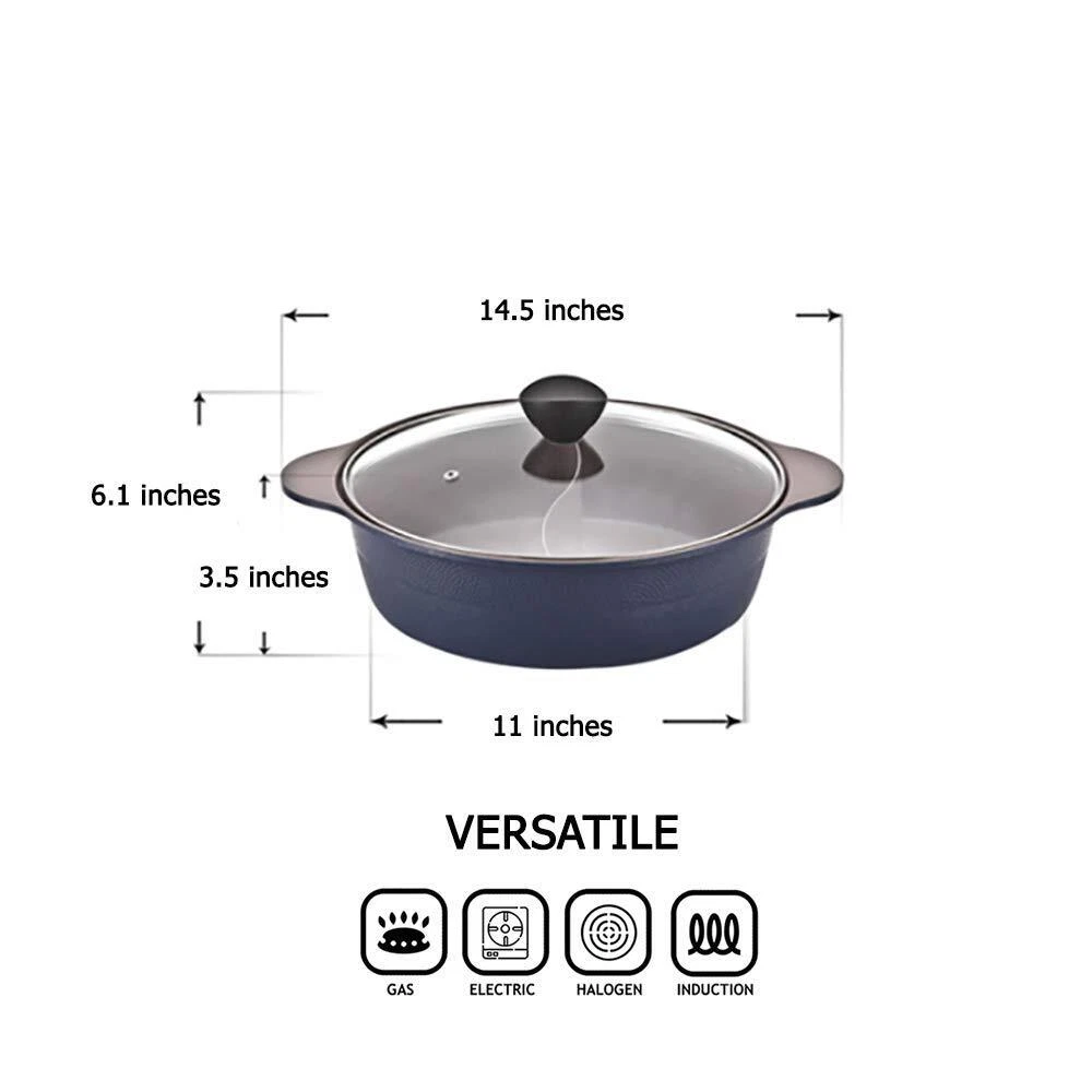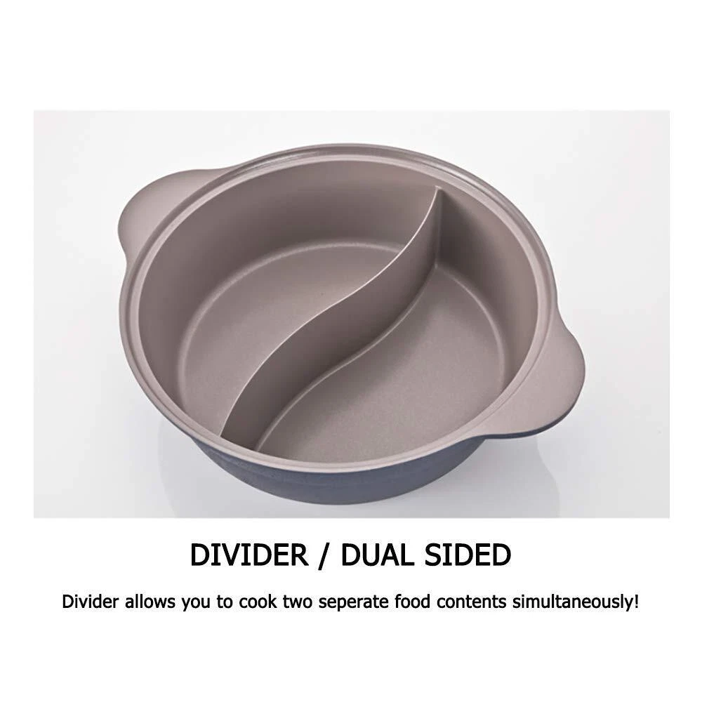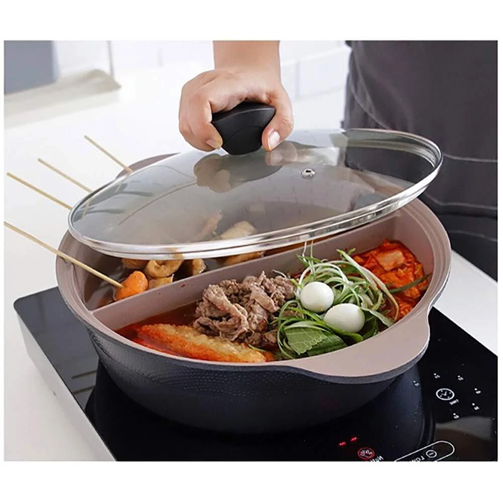 Kitchen Flower Cookin IH Shabu Shabu Divider Hot Pot, Ceramic Coating Double Sauce Pot 11inch. Made in South Korea. Materials: Aluminum, Interior / Exterior Ceramic Coating, Tempered Glass Lid (for boiling water), Stainless Steel, Bakelite (Knob). This is a very high quality product with the convenience of a dual sided/ divider for multiple users to cook food contents simultaneously. Beautiful design of the tempered glass lid for boiling water has a high dome design so you can cook food contents all the way up to the top of the pot without any spillage. The ceramic coating of interior / exterior makes for easy and convenient cleaning. Also due to the die casting exterior, the pot can cook fast and quickly with high heat conductivity. This is perfect for shabu shabu, Mongolian hot opt, Chinese and Taiwanese Hot pot, and all kinds of fondue and hot pot cooking! This pot is with multiple heat sources including: gas, , halogen, and induction. VERSATILE - with various heat sources: Gas, , Halogen, Induction! DESIGN - High Dome tempered glass lid allows to cook larger food contents at time! DIVIDER / DUAL SIDE - Allows for users to cook separate food contents at the same time! HIGH THERMAL CONDUCTIVITY - You can cook quickly with high heat conductivity by the exterior die casting! EASY & CONVENIENT - Interior and exterior ceramic coating makes it very easy and convenient to clean!