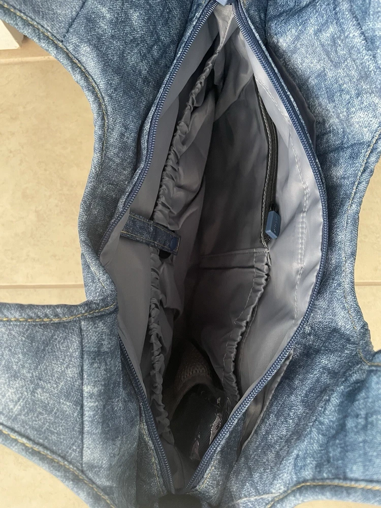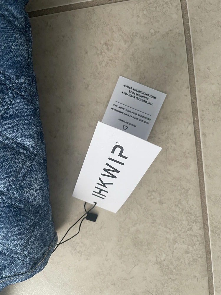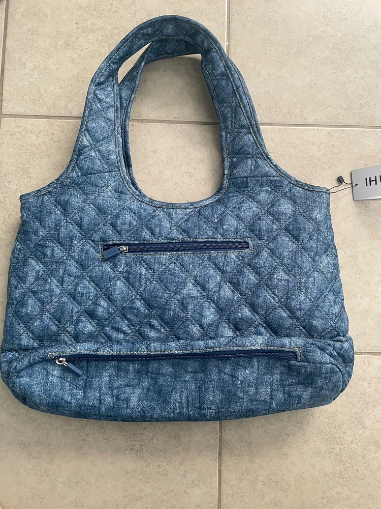 This IHKWIP quilted tote is perfect for everyday shopping and features a crossbody strap for added convenience. The exterior is made of durable nylon material in a stylish blue color with stitching accents. The tote has a spacious interior with a zippered pocket and is suitable for adult females. The tote is designed with a quilted finish and is ideal for any occasion. It is a must-have accessory for anyone who wants to add a touch of style to their daily routine. Has bottom pocket for umbrella. Umbrella not included.