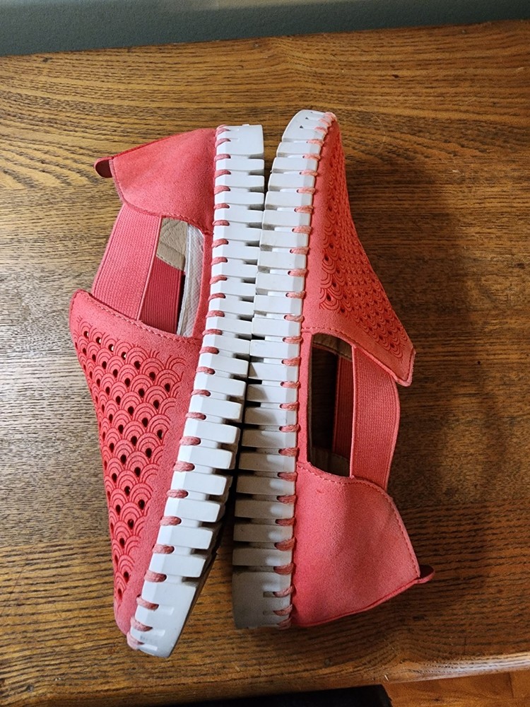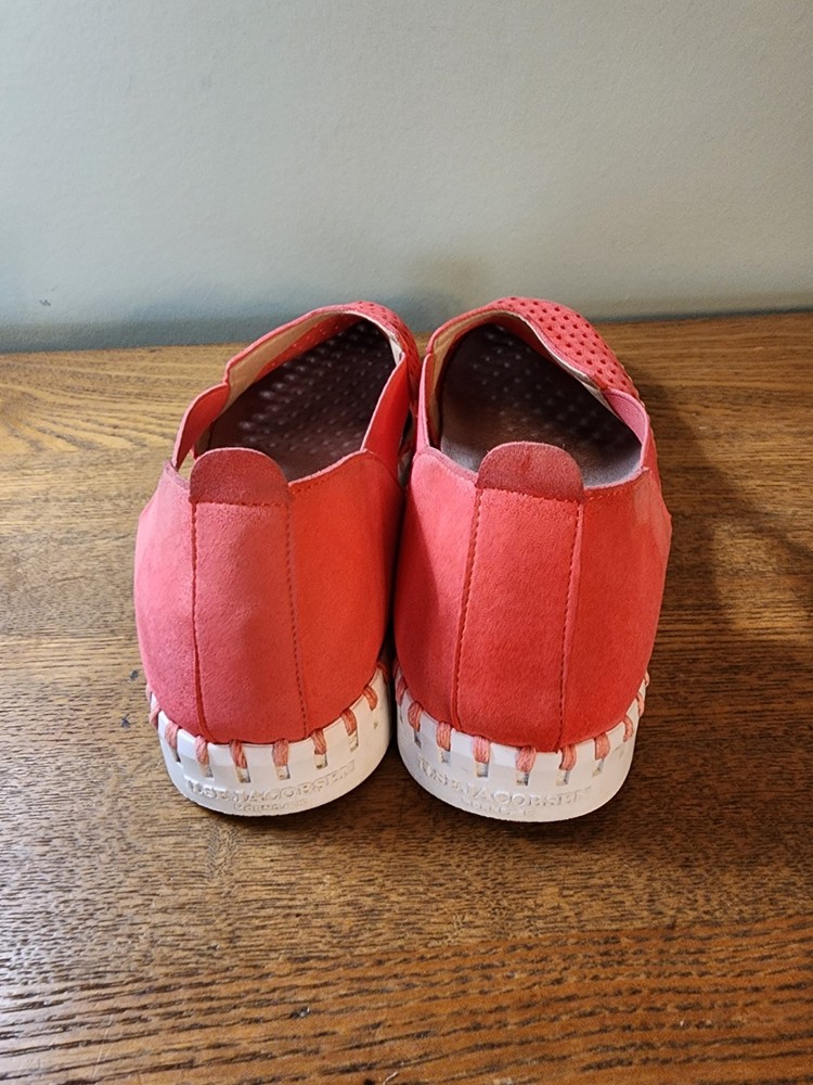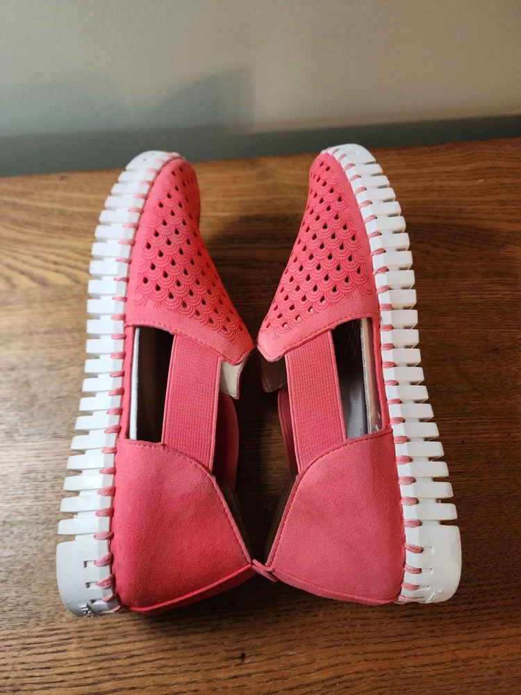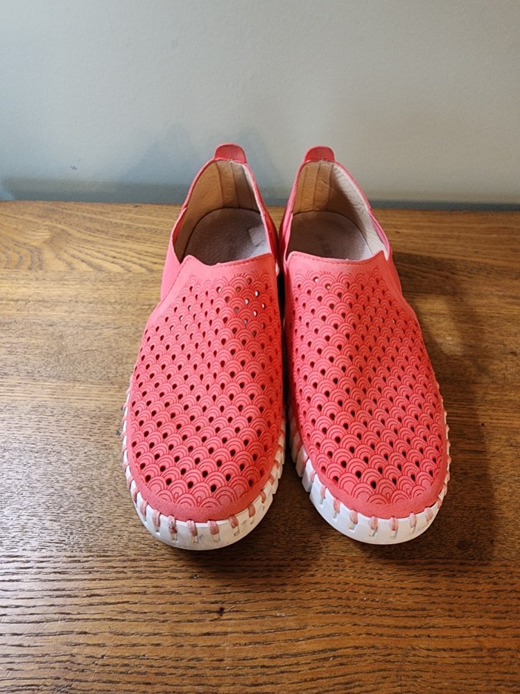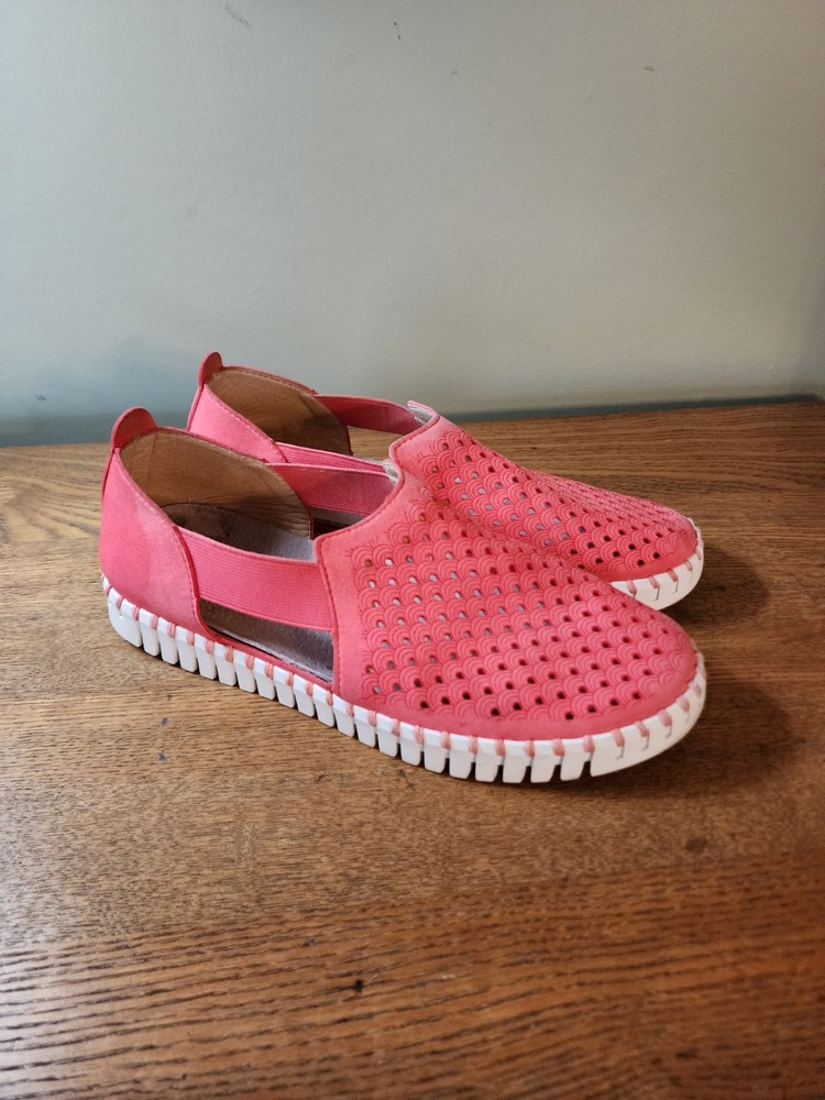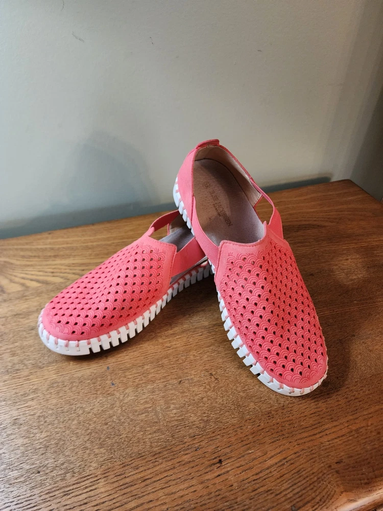 These Ilse Jacobsen Coral Slip-On Shoes in size 38 (US 8) are perfect for travel, casual wear, and even workwear. With a round toe shape, scalloped accents, and cushioned insole, they offer comfort and style. The breathable synthetic upper and leather lining, along with the rubber outsole, make them ideal for summer, fall, and spring seasons. Made in Denmark, these slip-ons by Ilse Jacobsen are designed for women who value both fashion and comfort in their footwear choices.