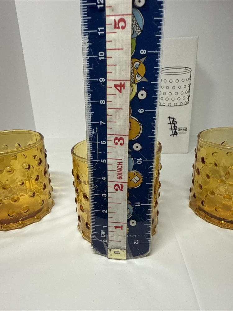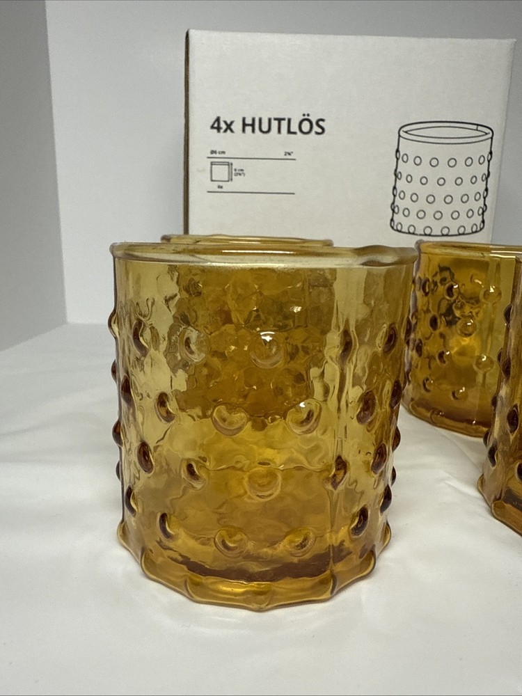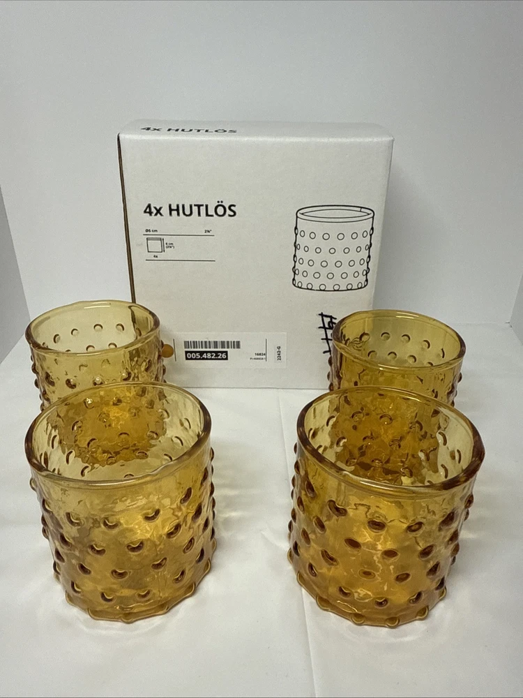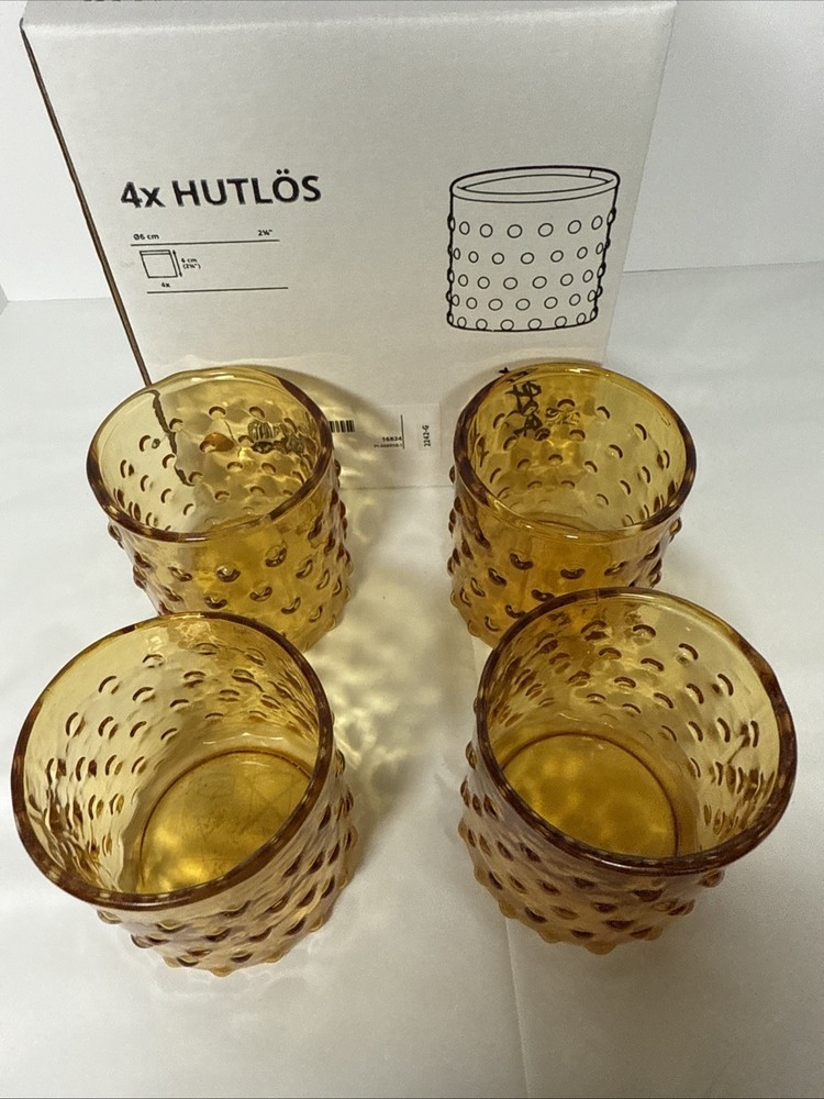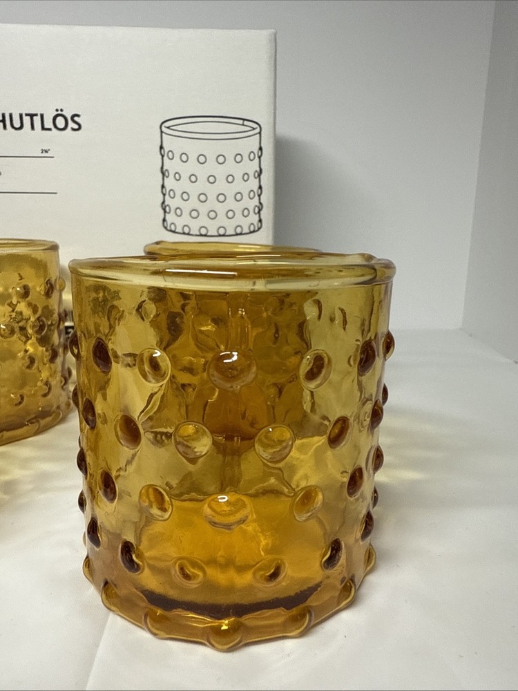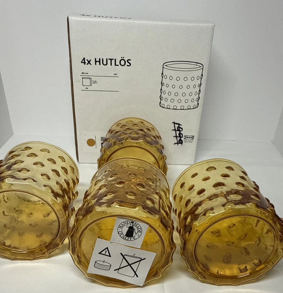 Original box, box does have some writing on it. The IKEA HUTLOS 4 Hobnail Amber Glass Votive Tea Light Candle Holders are a set of retro-style candle holders suitable for all occasions. Made of small-sized round glass with a shiny finish and textured hobnail pattern, these 2.5" holders are perfect for mini candles. Care instructions recommend cleaning with a damp cloth or warm water, and they come in a pack of 4. Ideal for indoor use in any room, these candle holders are a stylish and practical addition to your decor.