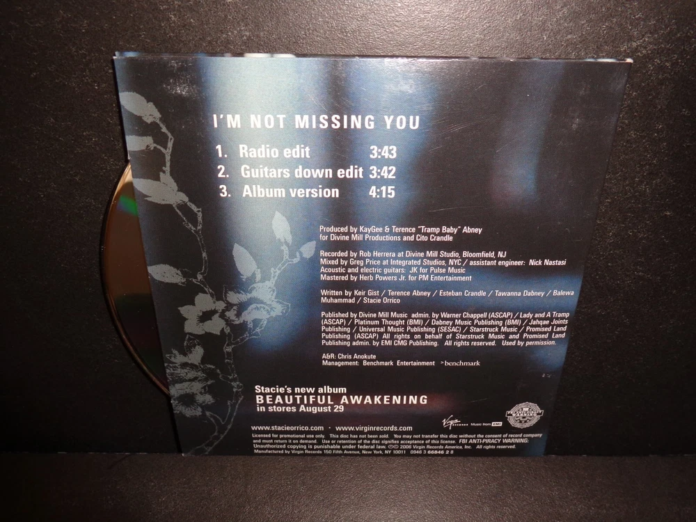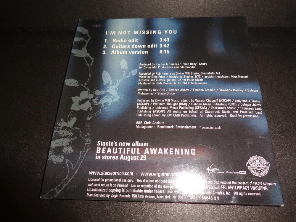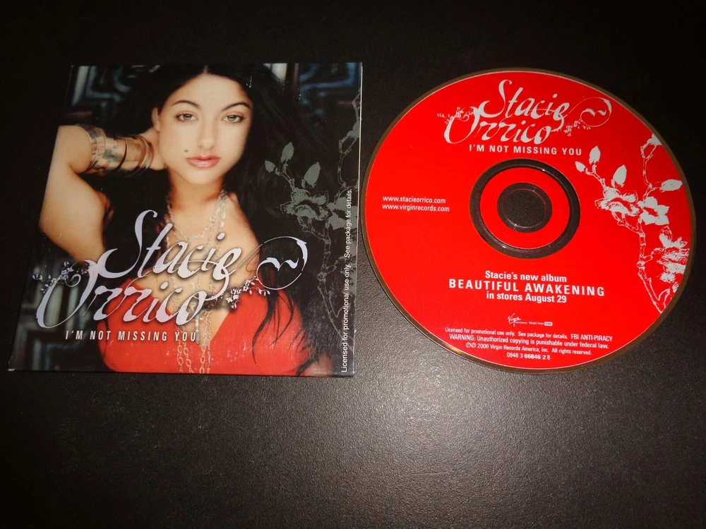 I'M NOT MISSING YOU by STACIE ORRICO Rare Collectible PROMOTIONAL CD Single The CD comes in a cardboard sleeve From the Album " Beautiful Awakening" Tracks include: 1. I'm Not Missing You - Radio Edit - Running time approximately 3 minutes 43 seconds 2. I'm Not Missing You - Guitars Down Edit - Running time approximately 3 minutes 42 seconds 3. I'm Not Missing You - Album Version - Running time approximately 4 minutes 15 seconds Check out my other items ! Be sure to add me to your favorites list !