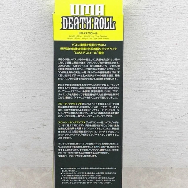 Bait Type: Swimbait Model: UMA death roll Material: Plastic UPC: Does not apply gtin13: Does not apply Fish Species: Bass, All Freshwater, All Saltwater Fishing Type: Freshwater Fishing Bait Shape: Fish Item Length: 150mm MPN: Does not apply Brand: Imakatsu Color: UMA Illusion Country/Region of Manufacture: Japan