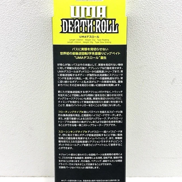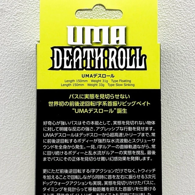 Color: UMA Illusion Material: Plastic Bait Type: Swimbait gtin13: Does not apply UPC: Does not apply Bait Shape: Fish Model: UMA death roll MPN: Does not apply Fishing Type: Freshwater Fishing Item Length: 150mm Country/Region of Manufacture: Japan Fish Species: Bass, All Freshwater, All Saltwater Brand: Imakatsu