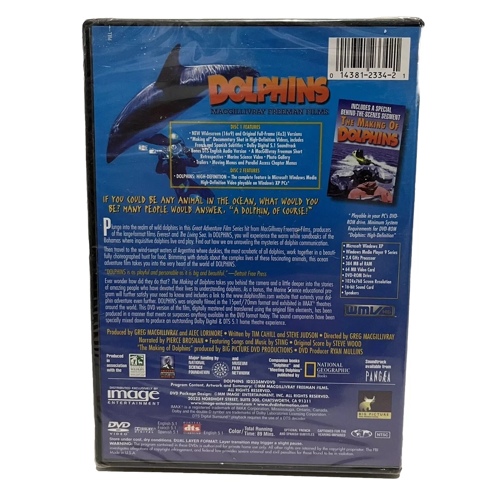Dive into the aquatic world with "IMAX - Dolphins" on DVD, a visually stunning journey directed by Macgillivray Freeman. Released in 2004, this DVD offers an immersive experience into the lives of these majestic creatures, showcasing their grace and behavior in their natural habitat. A perfect addition for those interested in educational content, this DVD falls within the Nature/Wildlife sub-genre and is suitable for all audiences, NR (Not Rated). Explore the fascinating underwater world and learn about these beloved marine mammals with this captivating IMAX experience. NTSC U.S./C Photos are actual item, view for condition Buyer pays return shipping NEW SEALED Sm tears on seal, see photos!!!
