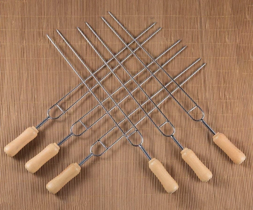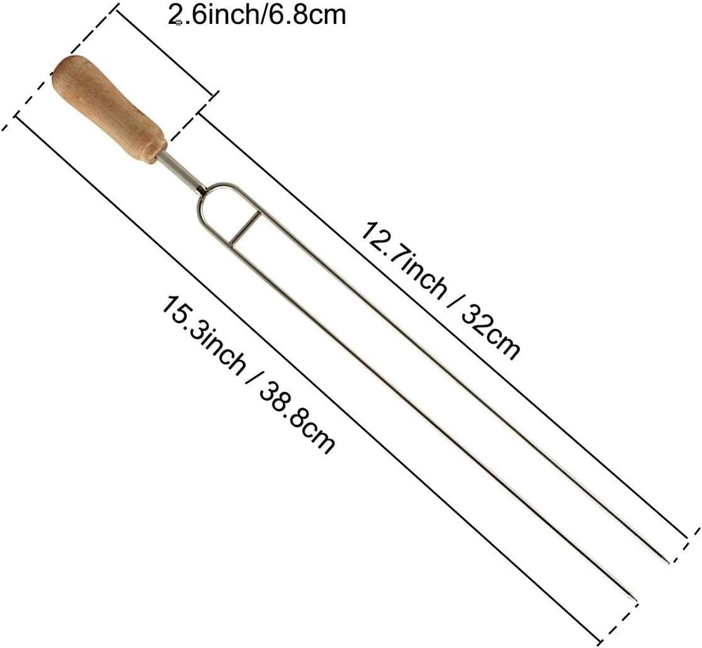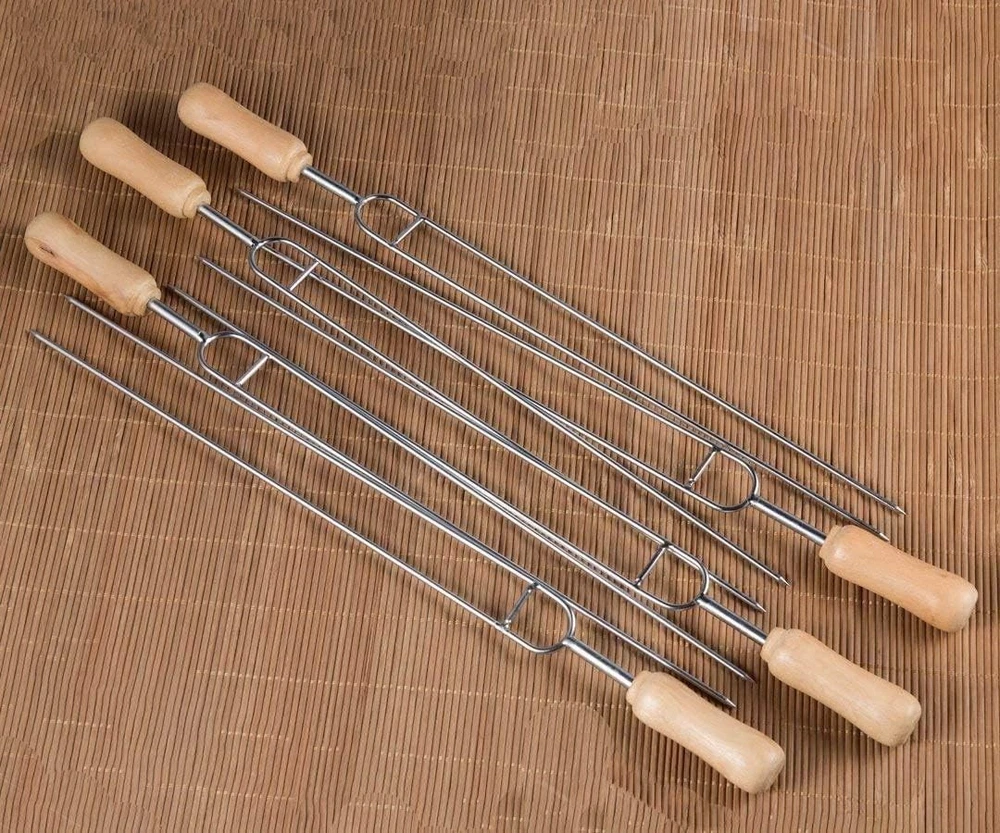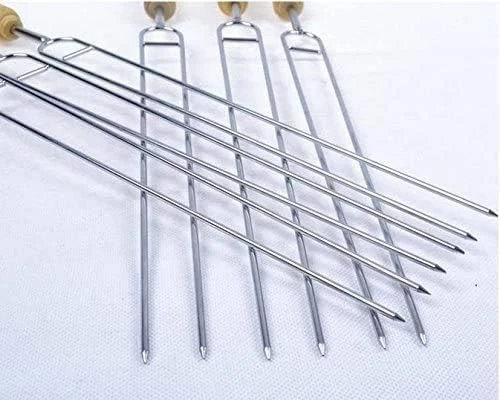IMEEA Double Pronged Skewers for Grilling Stainless Steel 6-Piece, Silver Product Details Material: Stainless Steel Color: Silver Item Length: 15.3 Inches Brand: IMEEA Item Weight: 0.35 Kilograms Number of Pieces: 6 Item Weight: 12.3 ounces Manufacturer: IMEEA Item model number: A239 Is Discontinued By Manufacturer: No Double Prongs: These well made barbecue skewers that have double prongs which means you can rotate them and all skewered items rotate without slippage. No more carefully checking each item is cooking as intended. Wooden Handle: Double prong skewers with wooden handle will keep your fingers from being burned and make them super easy to place, turn, and remove from the grill without needing tongs. Multi Usage: Our double prong bbq skewers are suitable for small pieces of shish kabob, chicken wings, meat, beef, lamb, kofta, kebab, koobideh, shrimp, prawn shashlik. vegetables: mushrooms, bell peppers, onions, cucumber, roma tomatoes, potatoes, etc. Material: These 15.3-Inch stainless steel grill skewers are made of high quality stainless steel has high hardness and good thermal conductivity. Our shish kabob skewers are reusable, easy to clean. Dimensions: Total Length: 15.3inch/38.8cm, Roast Needle Length: 12.7inch/32cm, Handle Length: 2.6inch/6.8cm. Great for camping, indoor grilling, outdoor BBQ or any other places you love.