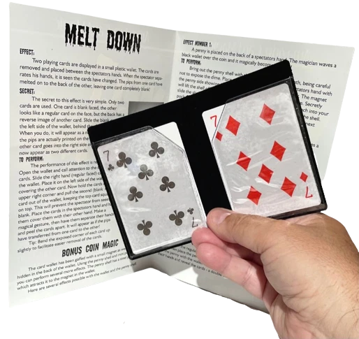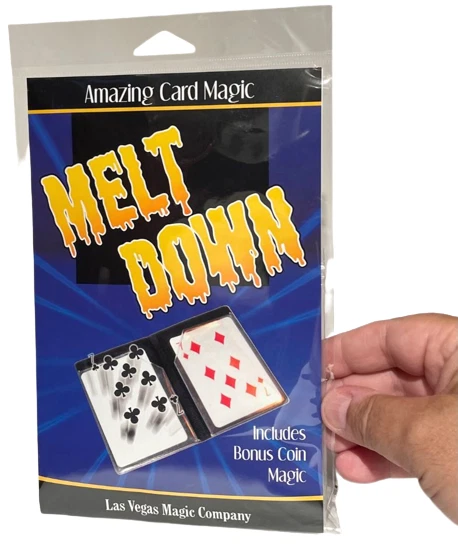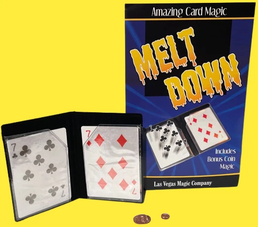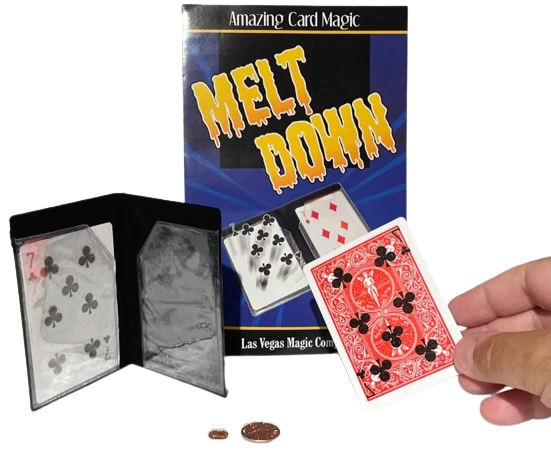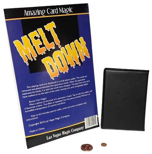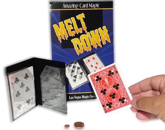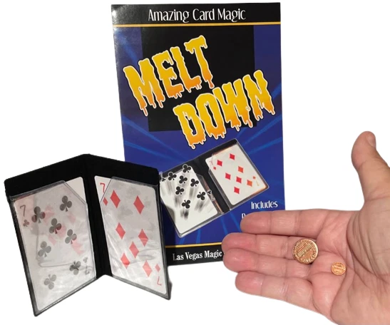 NEW Melt Down Improved ! By Las Vegas Magic Co. Two playing cards are displayed in a small plastic wallet. The cards are removed and placed between the spectators hands. When the spectator separates his hands, it is seen the cards have changed. The pips from one card have melted on to the back of the other, leaving one card completely blank! Bonus Coin Magic! Place a penny on the back of a spectator’s hand. Tap it with the wallet, and it becomes a dime (dime not included). The effect is repeated, but the penny shrinks! Perform an incredible transposition of a penny and dime! Easy to do! Includes special wallet, cards and coins (shim shell penny & mini penny) complete with instructions! Sale Includes: Black gimmicked wallet, 2 cards, shim penny, mini penny and instructions. Please Note: Cards have Bicycle design backs but are not made by Bicycle Card Co. Card suit may vary. WOW FREE SHIPPING! Trickmaster - blue tub Please check out my other great items including Geist Visual Comedian DVD's , Robbie Raccoons and much much more!