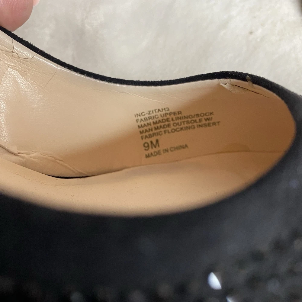 Heel Style: Stiletto Heel Height: High (3-3.9 in) AU Shoe Size: 8.5 Customized: No Brand: INC International Concepts Toe Shape: Pointed Toe Insole Material: Leather US Shoe Size: 9 Features: Cushioned, Non-Slip Personalize: No Color: Black Occasion: Party/Cocktail Outsole Material: Fabric Vintage: No EU Shoe Size: 40 Style: Pump Type: Heel gtin13: Does not apply Department: Women Theme: Classic UPC: Does not apply Upper Material: Synthetic Shoe Width: M Character: Glitter Model: INC International Concepts ZITAH3BLK Closure: Slip On Country of Origin: China Pattern: Flecked Lining Material: Faux Leather Accents: Sequin UK Shoe Size: 7