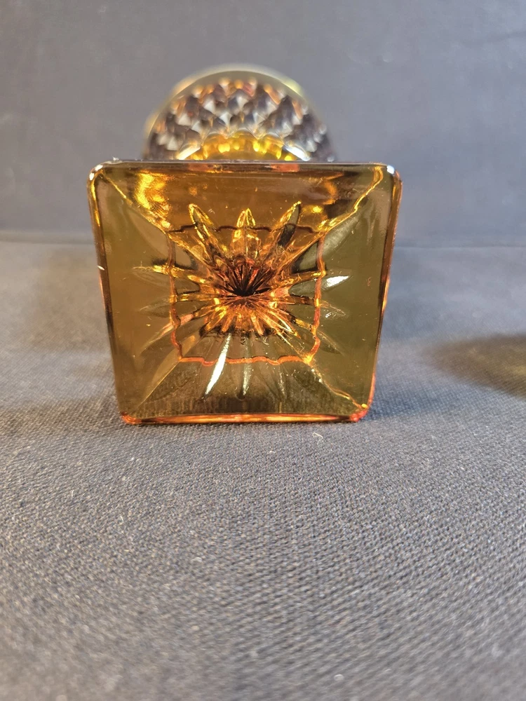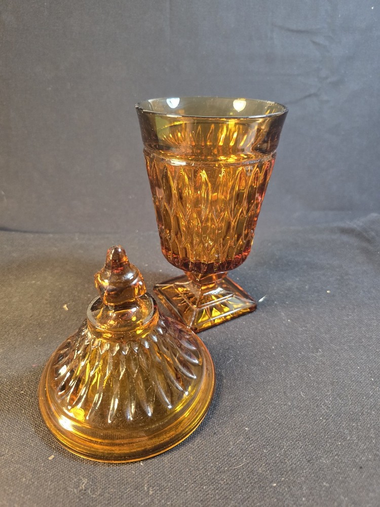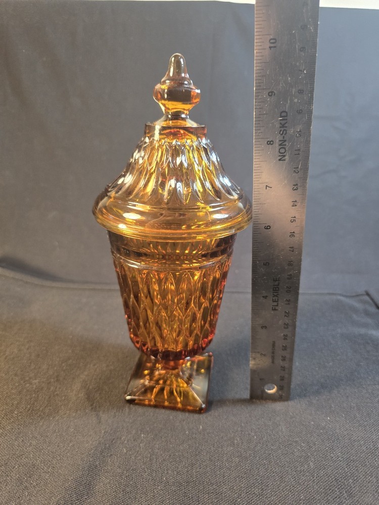 Vintage Indiana Glass amber lidded pedestal candy dish, approx. 9.75" tall. Rich fall-toned amber with diamond-textured pattern and square base. Ideal for seasonal décor or display. Condition: Small rim chip noted (photograph for buyer clarity); otherwise clean with expected vintage wear.
