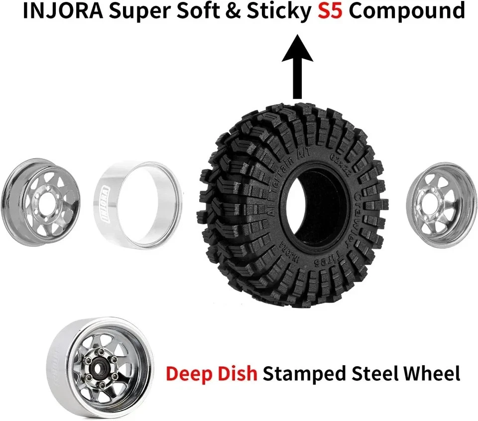 Product Description Upgrade your crawler’s performance with a wheel and tire combo built for extreme grip, stability, and durability. This 1.0” beadlock wheel & soft compound tire set features a -3.78mm negative offset, giving your RC rig wider stance and improved handling on uneven terrain — perfect for technical crawling. The high-quality stamped steel beadlock wheels deliver real weight and improved traction, while preventing tire slippage in high-torque situations. Paired with super soft, sticky rubber compound tires, you get unbelievable grip on rocks, wood, dirt, and trail surfaces. Designed specifically to fit popular 1/24 & 1/18 RC crawlers, this set is the ultimate upgrade for anyone who wants maximum crawling capability and a more aggressive stance. Push harder. Climb higher. Crawl like a pro. ⭐ Key Features & Performance Benefits Aggressive -3.78mm Offset Widens the stance for increased stability and improved sidehill control. Stamped Steel Construction Adds weighted realism + strengthens handling under steep climbs. Super Soft Sticky Compound S5 rubber grips tight to rocks, logs, and technical surfaces. True Beadlock Design No glue needed — prevents tire slip under high torque. Heavy-Duty Bias Ply Tires Flexible tread + tough construction for long-lasting performance. Perfect Fit for 1/24 & 1/18 Crawlers Works with SCX24, FCX24, TRX4M, AX24, and similar models. Scale Look, Competition-Level Performance Boosts capability without sacrificing appearance. 🔍 Suggested Item Specifics / Attributes Attribute Details Condition New Type 1.0” Beadlock Wheels & Tires Set Wheel Material Stamped Steel Tire Material S5 Super Soft Rubber Tire Size 62mm x 22mm Wheel Offset -3.78mm Compatible Scale 1/18, 1/24 Compatible Models Axial SCX24, AX24, TRX4M, FMS FCX24 & similar Quantity 4 Wheels + 4 Tires Features Beadlock, Soft Compound, Durable, High Grip, Negative Offset Color Grey (Wheels) For Vehicle Type RC Rock Crawler