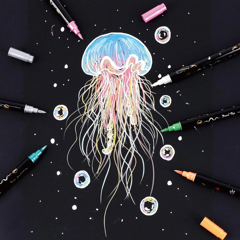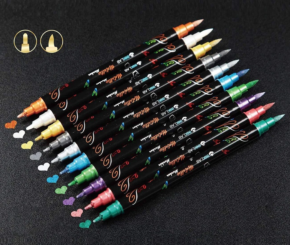 Metallic Markers: Made with premium water-based opaque ink, these markers are ASTM D4236 certified, non-toxic, odorless, quick-drying, fade-resistant, and offer strong coverage for shiny embellishments on various crafts 24 Vibrant Metallic Colors: Includes 24 metallic colors such as green, red, purple, light green, blue, silver, black, gold, white, and bronze. Designed for black surfaces, white appears transparent but turns opaque when dry Dual Tip Metallic Markers: Features medium and brush tips for versatile use. The medium tip is firm for bold marks and clean lines, while the brush tip allows for fine or bold strokes (0.38-5 mm), perfect for detailed work Most Surfaces Available: Works well on photos, card stock, rocks, plastic, mugs, fabric, metal, wood, ceramics, glass, and is especially effective on black or dark surfaces. Consistent ink flow, no shaking needed Multifunctional Metallic Markers: Ideal for art projects, black paper crafts, DIY crafts, drawing, customized mugs, rock painting, adult coloring activities, and making personalized presents for family and friends