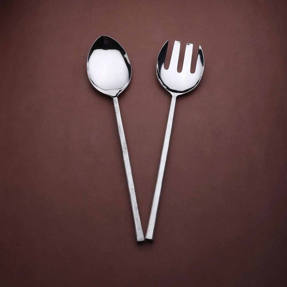 Inox artisans' hand-forged tableware with unique texture with a subtle, raw, and nascent handles, contrast with mirror-polished heads for a striking, contemporary tableware collection. Handle finishes on our design JASON are rustic and organic will vary, according to subtle differences in the handcrafted process and natural pitting. Best suited for perfect casual or elegant entertaining. Each simply-styled stainless piece has a smooth, substantial handle and beautiful mirror finish. These classically styled serving pieces are well-balanced and comfortable in hand.Dishwasher safe.Passed by International reputed labs for various food safe standards.Perfectly balanced and handcrafted for performance.Avoid lemon scented or corrosive detergents.Handmade and forged with high grade stainless Free Shipping Over $49.99* Details INOX Jason Salad Serving 2 Pc. Set Product Description: Inox artisans' hand-forged tableware with unique texture with a subtle, raw, and nascent handles, contrast with mirror-polished heads for a striking, contemporary tableware collection. Handle finishes on our design JASON are rustic and organic will vary, according to subtle differences in the handcrafted process and natural pitting. Best suited for perfect casual or elegant entertaining. Each simply-styled stainless piece has a smooth, substantial handle and beautiful mirror finish. These classically styled serving pieces are well-balanced and comfortable in hand. Dishwasher safe. Passed by International reputed labs for various food safe standards. Perfectly balanced and handcrafted for performance. Avoid lemon scented or corrosive detergents. Handmade and forged with high grade stainless steel. Ornamentation and design pattern is precisely rendered with depth and clarity on both sides. The handles are not so narrow that when held doesn't press uncomfortably into the palm. Fork tines are symmetrical, the edges are rounded, perfectly tapered, and polished on all sides. Spoon is deep enough to accommodate a good volume.