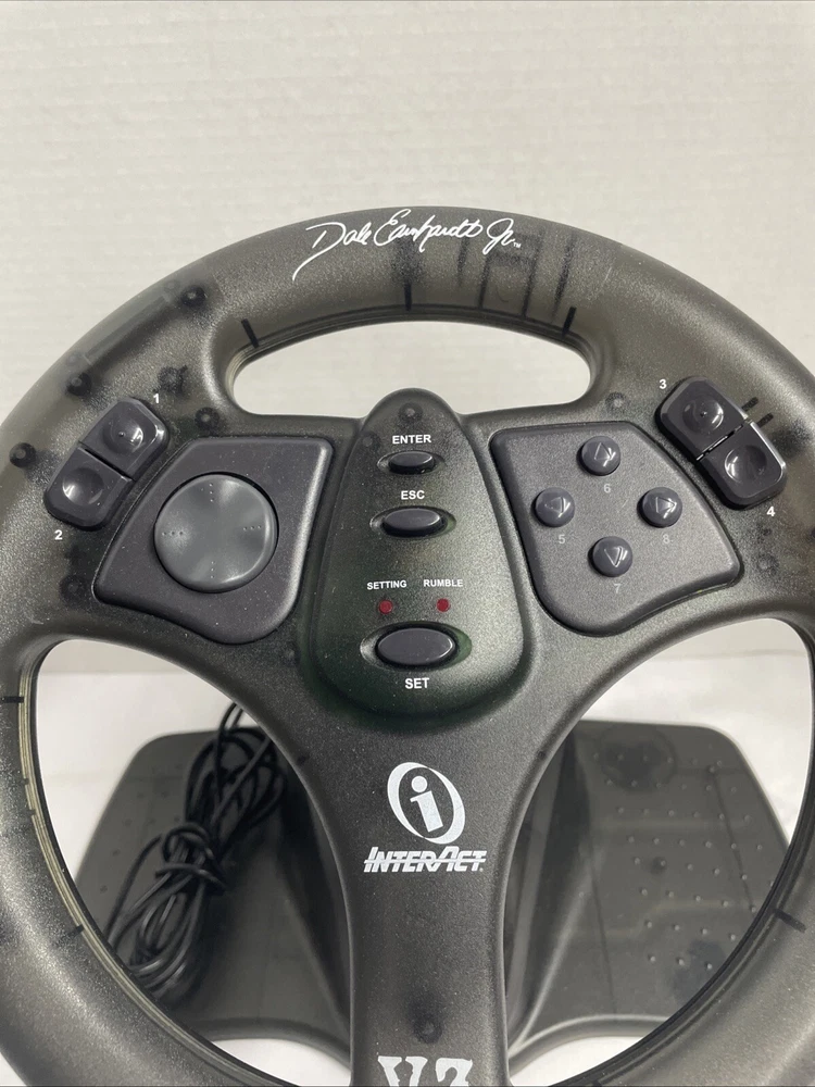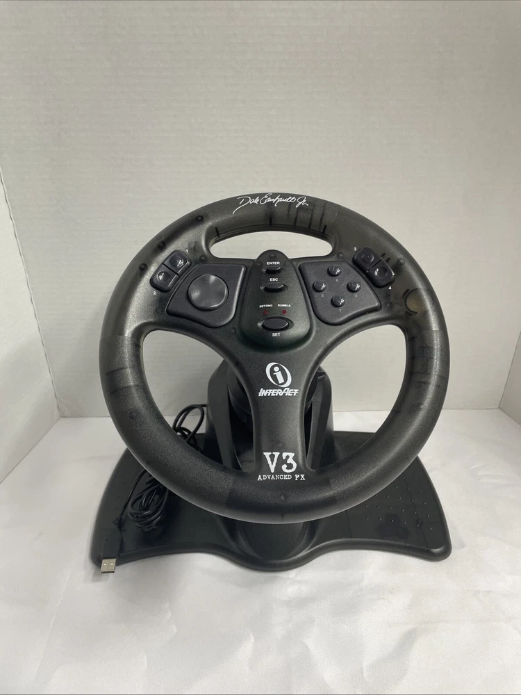 The product is an InterAct V3 Advanced FX Dale Earnhardt Jr steering wheel for video games. It is a wired navigation controller/nunchuck in black color with a steering wheel feature. The model is V3 Advanced FX. UNTESTED SOLD AS IS