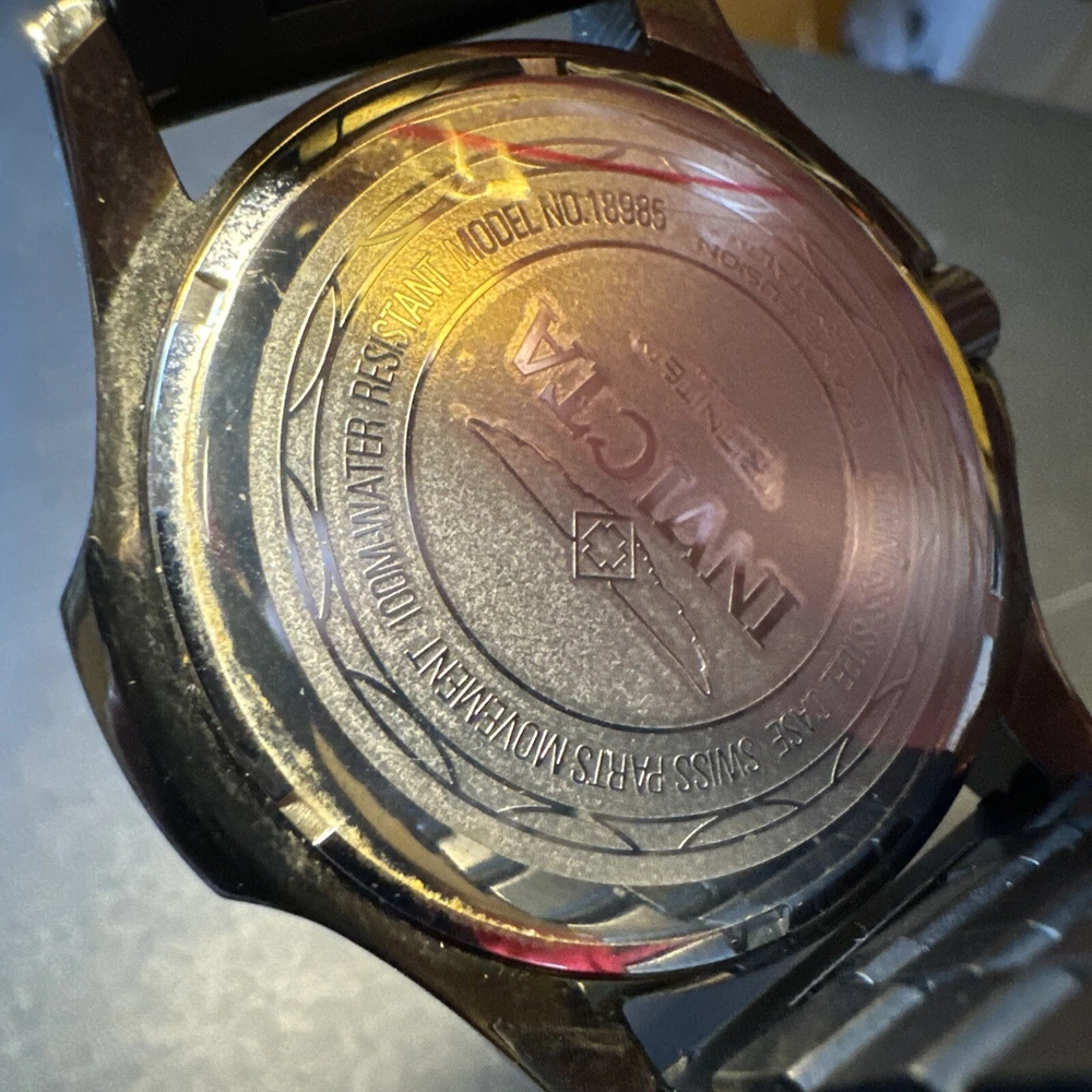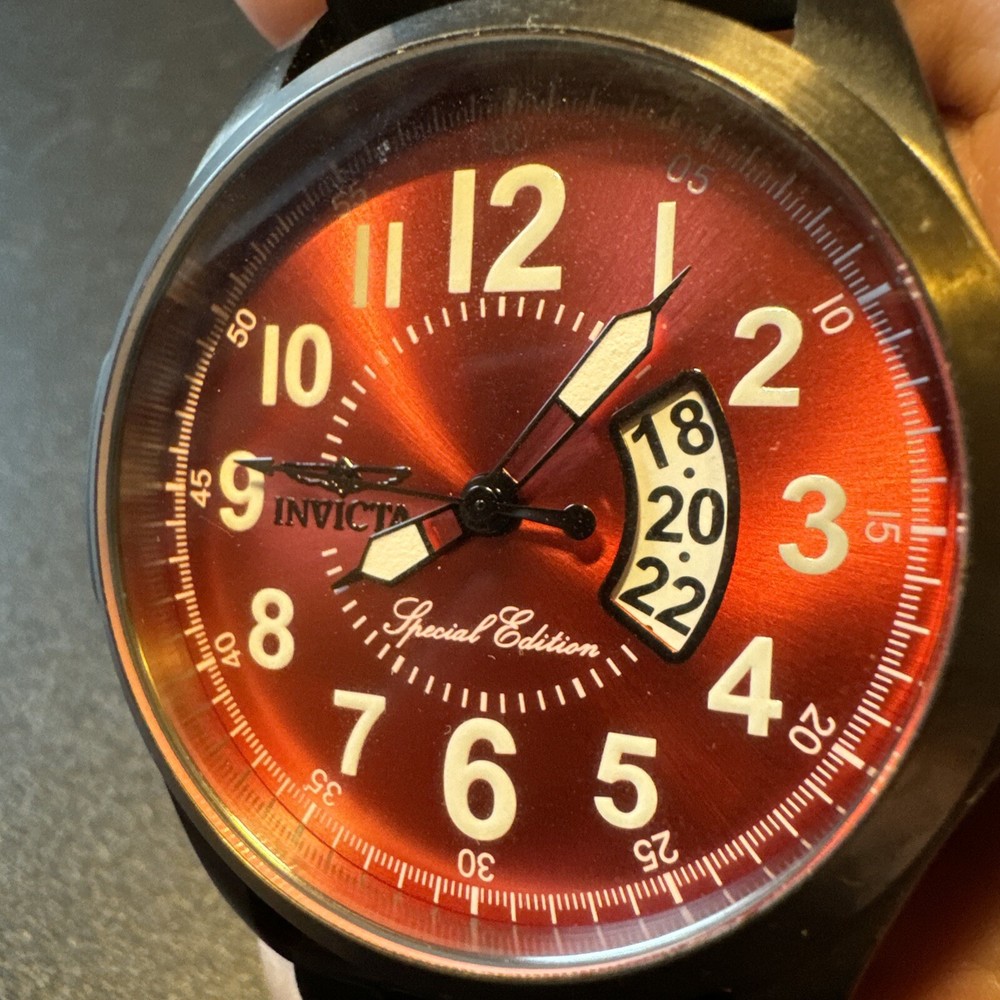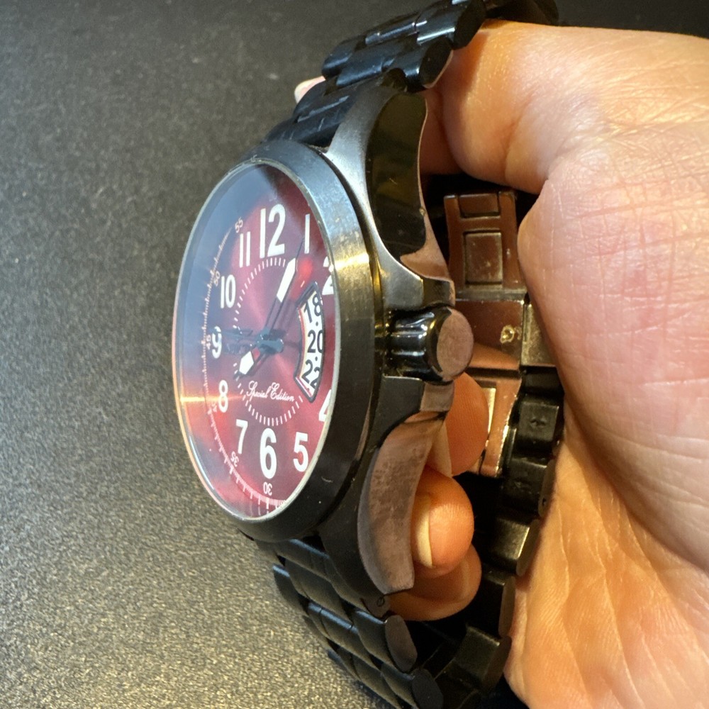 Elevate your style with this stunning red Invicta Force wristwatch. Crafted from high-quality steel, this special edition timepiece boasts a sleek analog display and powerful quartz movement. With a water resistance of up to 100 meters, this watch is perfect for the adventurous man. The reference number 18985 adds a touch of sophistication to the design, making it a great addition to any collection. Ever since its founding in 2008, Invicta has been known for its high-quality watches that are designed to impress. This wristwatch is no exception, with its striking red case and elegant design. It's perfect for men who want to make a statement with their accessories. Add this incredible timepiece to your collection. Personal used condition in collection. Not currently running. NEEDS NEW BATTERIES! Bought couple years back and it's been in storage. No box. Just the watch itself with the band. Very good pristine condition. Currently sold out at retail value on official site rare to find. offers welcome.