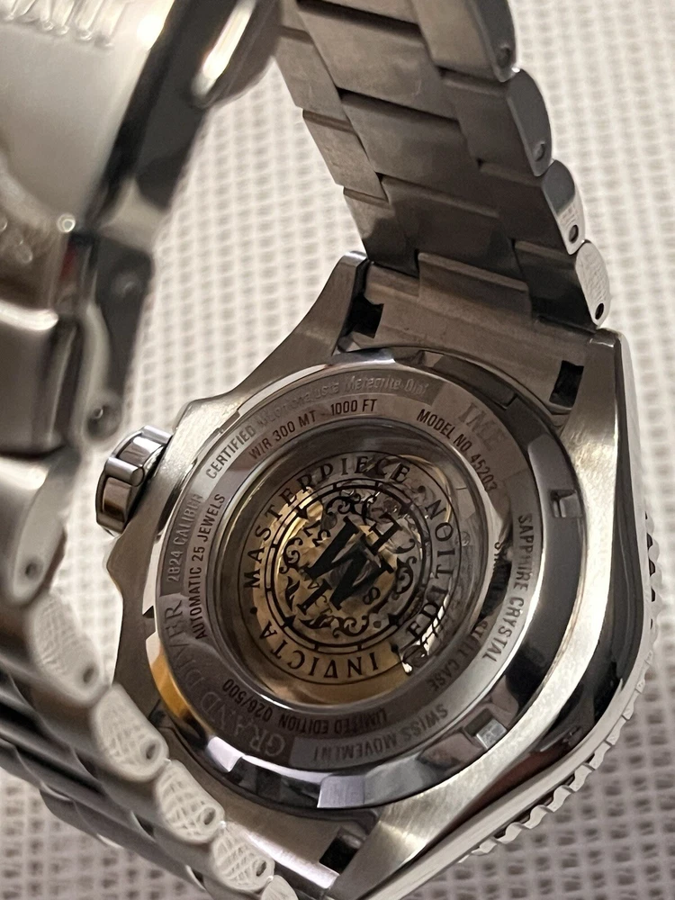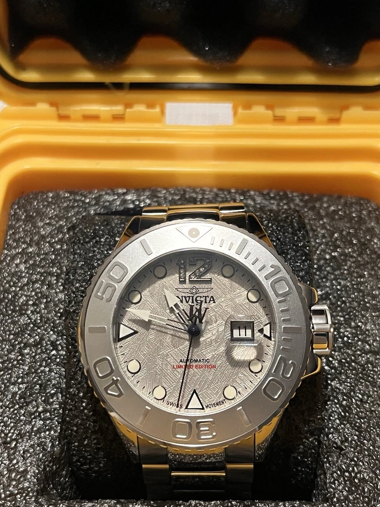 INVICTA MASTERPIECE GRAND DIVER 45203 METEORITE DIAL SWISS ETA AUTO LE 026/500 WATCH WAS USED A FEW TIMES WORKS AS SHOULD SIZED TO AROUND 8”INCH WRIST NO EXTRA LINKS ARE INCLUDED BUT IT FITS BIG YOU ARE GETTING EXACTLY WHAT YOU SEE IN THE PICTURES SO REFER TO THEM About the watch This incredible Invicta watch from the Masterpiece collection offers an exact Automatic movement, with an incredible 0.04 carats of authentic diamonds, and a sophisticated steel, silver case. The face displays a silver, meteorite, metal dial protected by our proprietary Sapphire Crystal. The design is completed by a steel, band. This timepiece can resist water for up to 300 m. Since its inception in La Chaux-de-Fonds, Switzerland in 1837, a commitment to excellence and innovation has been at the heart of every collection created by Invicta. Here at Invicta Stores, we offer the most extensive catalog of timepieces from this magnificent brand at the lowest price. HomeSales EventsSwiss Movement Sale - Up To 80% OFF! Invicta Masterpiece 0.04 Carat Diamond Swiss ETA 2824 Caliber Automatic Men's Watch w/ Meteorite Dial - 52mm, Steel (45203) Case & Dial Dial Color Silver Dial Material Meteorite, Metal Case Size 52 Case Tone Steel, Silver Case Material Aluminum, Steel Bezel Function Uni-directional Crown Type Screw Down Stone Type Diamond Luminous Color White Luminous Material New Lite Movement Movement Type Automatic Swiss Made Movement Components Swiss Movement Vendor ETA Movement Caliber 2824 Movement Jewels 25 Band Band Material Stainless Steel Band Length (mm) 210 Band Size (mm) 24 Buckle Type Fold over safety Interchangeable Band No Clasp Type Deployment, Safety