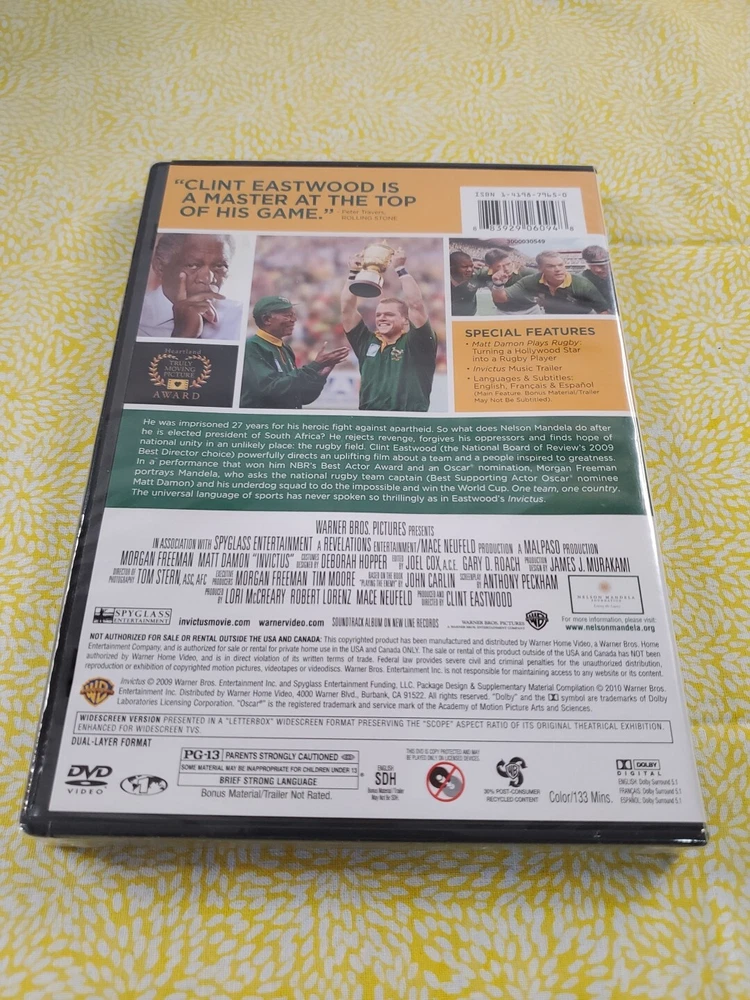 Producer: Clint Eastwood, Lori Mccreary, Mace Neufeld, Robert Lorenz Type: Movie Genre: Drama Movie/TV Title: Invictus Format: DVD Rating: PG-13 Studio: Warner Home Video Actor: Morgan Freeman Edition: Standard Edition Subtitle Language: English, French, Portuguese, Spanish Sub-Genre: Biography Director: Clint Eastwood Run Time: 133 min. Release Year: 2009 Language: English, French, Spanish UPC: 0883929060948 gtin13: 0883929060948 Features: Widescreen