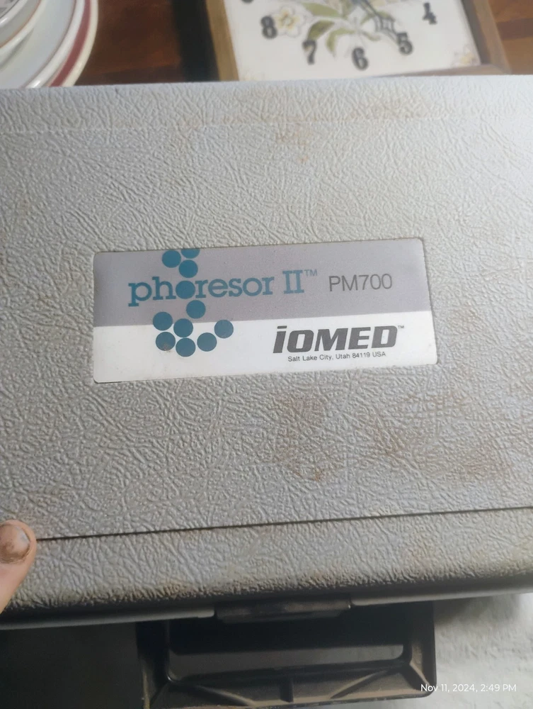Complete IOMED Phoresor II PM700 Iontophoresis System designed for professional therapeutic use. This device facilitates medication delivery through iontophoresis, making it a valuable tool for physical therapists or healthcare providers. Includes: IOMED Phoresor II PM700 control unit. Carrying case with custom foam inserts for secure storage. Electrode cables and wires. Viscolas Flexigrip hand exerciser. Additional accessories as shown in photos. Condition: The unit is untested, sold as is. The carrying case shows some external wear, consistent with regular use (see photos). Accessories appear complete and in good condition. This system is ideal for professionals looking for a reliable iontophoresis device. Please review photos carefully and feel free to ask any questions before purchasing. Note: Consult the manufacturer or a professional to ensure proper use and compatibility with your clinical needs.