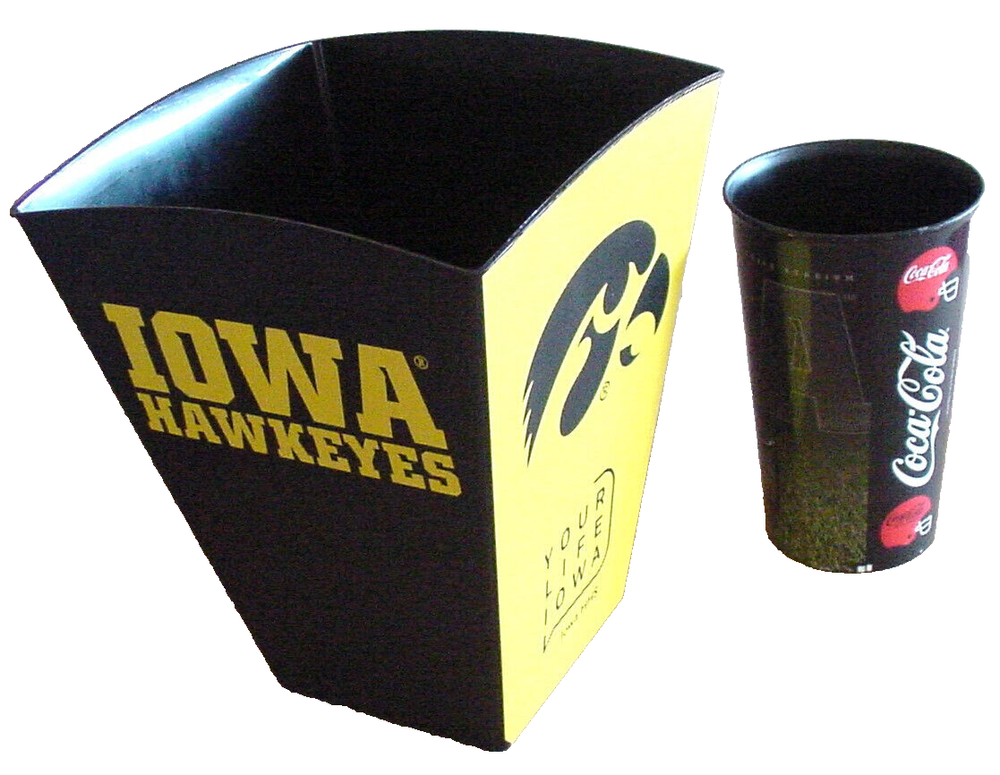 Show off your team spirit with this Iowa Hawkeyes Popcorn Bucket and Kinnick Stadium Coca-Cola Beverage Cup. Perfect for game day or any occasion, this bucket is a must-have for any fan. The bucket features the iconic Iowa Hawkeyes logo and is perfect for holding popcorn or your favorite snacks. Popcorn container is 7" x 7" and 9" tall. Beverage cup is 6-1/2" tall. Both are plastic. Wherever you're cheering on the team with other fans or watching from home, this popcorn bucket and drink cup is sure to impress.