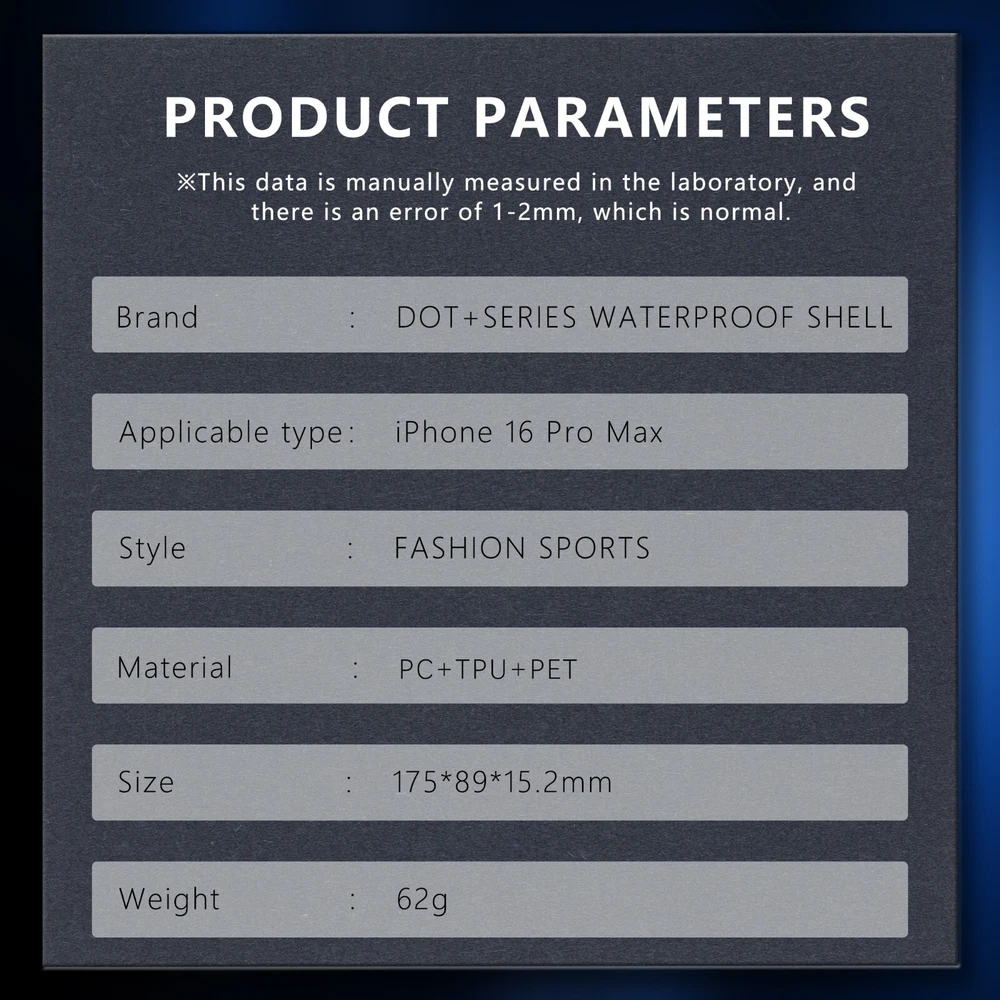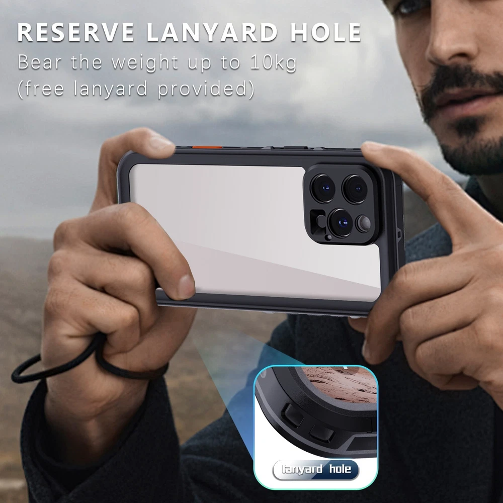 IP68 Underwater Full Body Waterproof Shockproof Case For iPhone 16 15 14 Pro Max + Note: The pictures shown are as samples, while the item delivered to you will be the same as your chosen model. If there are any problems when you receive the package, please contact us before leave any feedback.We will solve it for you patiently. Feature: 1-IP68 standard waterproof case, This waterproof case designed for underwater and tested to submersible to 10ft/3 meters and 6.6ft/2 meters deep for 30 minutes. shockproof/snowproof/dustproof. 2-Gives you enough confidence, protect your phone from shock and drop. Keep no screen protective film on your phone because the case comes with a screen protector. 3-Use the camera well and shoot beautiful photos and videos in high definition. 4-This waterproof case supports wireless charging, which ensures that your phone could charges quickly without removing your waterproof case. Easy to Install 1-Please remove the screen protector from the phone before installing this waterproof case, which will compromise the touch sensitivity and keep the case from being closed completely. 2-Please follow the instruction and install this case correctly. Make sure all the hole and thin seam-sealed tight. 3-Please do a water-test before installing the phone into this waterproof case. Ensuring that all the ports have been completely sealed. Package Included: 1 x Waterproof Case 1 x Cleaning Cloth 1 x Lanyard 1 x User Manual