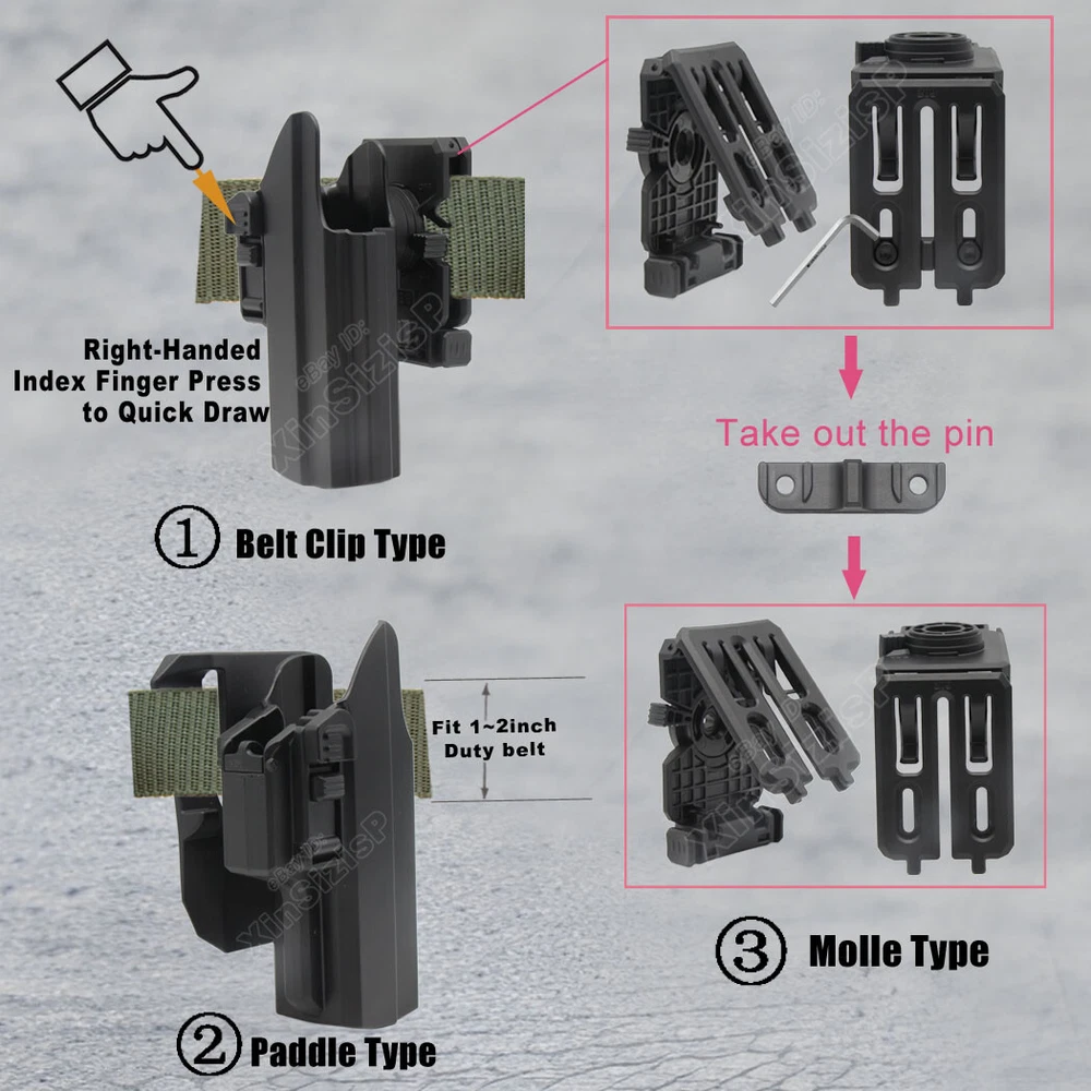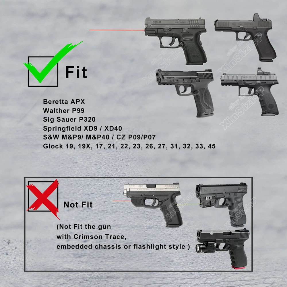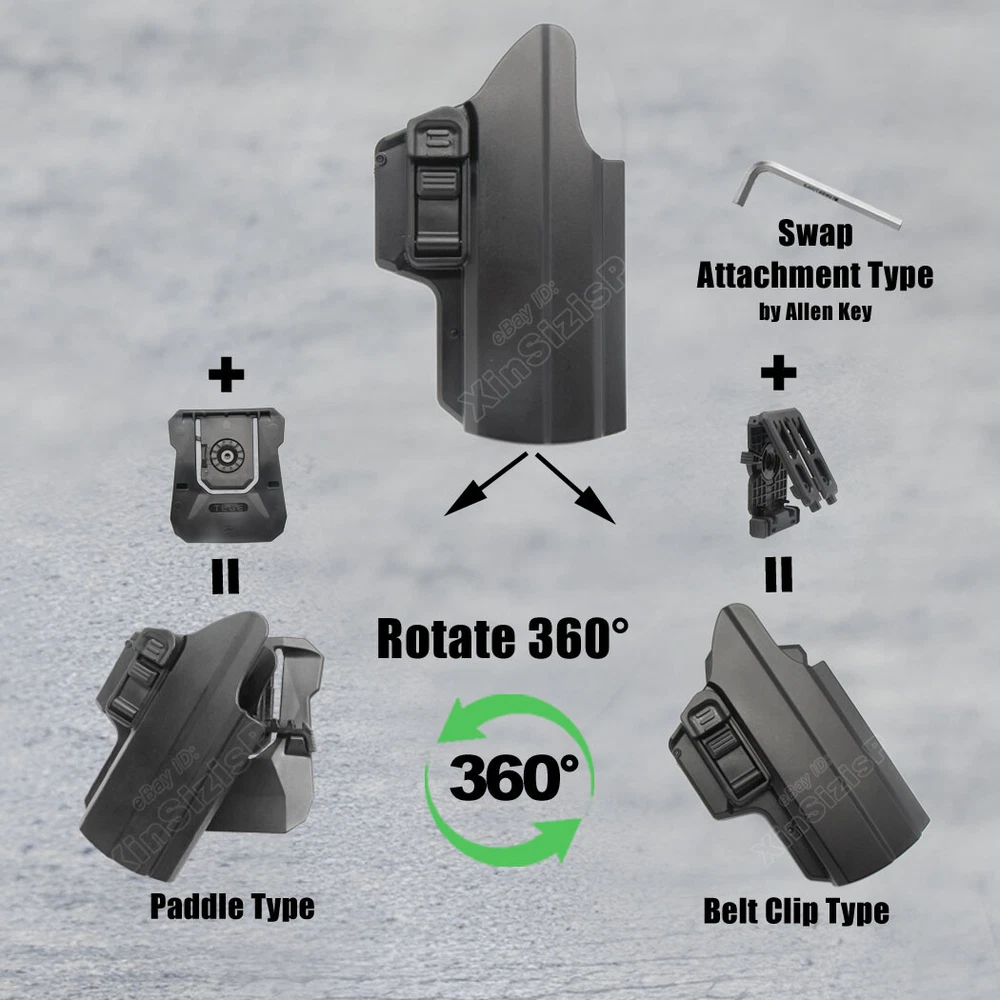 High Quality Military & Police Grade Polymer OWB Holster Specially Designed For Fast Draw During Duty Or Shooting Competition. This is a Combo Holster Comes With Paddle and Belt Clip Attachment ,which means you can swap paddle type to belt clip type with the Allen key by yourself. Outside Waistband Tactical Holster This holster fits 9mm, 10mm, and .40 caliber firearms but is not compatible with .45 caliber models. Holster Fit Glock 19 (Gen 1-5) Glock 19X Glock 17 (Gen 1-5) Glock 21 (Gen 1-5) Glock 26 (Gen 1-5) Glock 27 (Gen 1-5) Glock 31 (Gen 1-5) Glock 32 (Gen 1-5) Glock 33 (Gen 1-5) Glock 45 (Gen 1-5) Glock 22 (Gen 1-4) Glock 23 (Gen 1-4) Holster Fit Smith & Wesson M&P 9 M2.0 4.25" 9mm Luger Smith & Wesson M&P 10mm M2.0 4" 10mm Auto Smith & Wesson M&P 10mm M2.0 4.6" 10mm Auto Smith & Wesson M&P 40 M2.0 3.6" Subcompact .40 S&W Smith & Wesson M&P 9 M2.0 3.6" Compact 9mm Luger Smith & Wesson M&P 9 M2.0 3.6" Subcompact 9mm Luger Smith & Wesson M&P 9 M2.0 4.0" Compact 9mm Luger Smith & Wesson M&P 9 M2.0 5" 9mm Luger Holster Fit Walther P99 AS 9mm Luger Walther P99c 9mm Luger/.40 S&W Walther PPQ 9mm Luger Holster Fit Springfield XD 9, XD 40, 5" 9mm Luger/.40 S&W Springfield XD 9, XD 40, Full Size 4" 9mm Luger/.40 S&W Springfield XD MOD.2 4" Service 9mm Luger Springfield XD MOD.2 Subcompact 3.3" 9mm Luger Springfield XD Subcompact 3" 9mm Luger/.40 S&W Springfield XD-M 4.5" 10mm Auto Springfield XD-M 5.25" Competition 10mm Auto Springfield XD-M Elite 3.8" 9mm Luger Springfield XD-M Elite 4.5" 9mm Luger Springfield XD-S MOD.2 .40 S&W Holster Fit Beretta APX 9mm Luger/.40 S&W Beretta APX Compact 9mm Luger/.40 S&W Beretta APX Centurion 9mm Luger/.40 S&W Beretta APX Centurion Combat 9mm Luger Note: Not compatible with Beretta APX A1 Carry and Beretta APX Carry 3.5". Holster Fit Tisas Zigana PX-9 9mm Holster FitBRG9 Elite 9mm Holster Fit Sig Sauer P320 (9mm/.40) series all models Sig Sauer P220 (9mm/.40) series all models Sig Sauer P229 (9mm/.40) series all models Sig Sauer SP2022 (9mm/.40) series all models Sig Sauer P226 (9mm/.40) series all models Sig Sauer P228 (9mm/.40) series all models Holster Fit CZ P-07 9mm Luger CZ P-09 9mm Luger CZ P-10 C 9mm Luger CZ P-10 F 9mm Luger CZ P-10 M 9mm Luger CZ P-10 S 9mm Luger CZ P-10 SC 9mm Luger Holster Fit Sarsilmaz SAR 9 Sarsilmaz SAR 9X Sarsilmaz SAR 9 Compact Sarsilmaz SAR 9 SP Sarsilmaz SAR 9 Sport Sarsilmaz SAR 40 Sarsilmaz SAR K2P Sarsilmaz SAR B6 Sarsilmaz SAR B6C Sarsilmaz SAR B6C 7.65 Sarsilmaz SAR B6C-LR Sarsilmaz SAR B6C-S Sarsilmaz SAR CM9 Sarsilmaz SAR ST9 Sarsilmaz SAR 2000 Sarsilmaz K12 Sport Sarsilmaz K12 Sport X Sarsilmaz K11 Sarsilmaz AR-24 Sarsilmaz AR-24K Sarsilmaz Kilinc 2000 Light Sarsilmaz Kilinc 2000 Mega Sarsilmaz P8 L Sarsilmaz P8S ( I t perfect fit the gun with Optic Mou nt Mini Sight a bove on the end of the barrel , B ut without laser and no embedded chassis, and no flashlight style ) Ease and Comfort Push side buttons to achieve the fast opening and closing, unique design allows for belt carrying or vest carrying, perfectly used by duty holsters, uniformed law enforcement officers, security personnel, military personnel, private persons, and shooting sports holsters. And it fits closer to the body which can achieve better concealment under clothes. High S afety Secure Level II Retention - Locking system restrain pistol in the holster to ensure ultimate safety, activate the release by pressing the button with the index finger to achieve gun access . A djustable Easily set Holster 360 degrees to your desire position with Allen key, compatible belt width up to 2 inch . Tough & Durable Material Custom-molded body made of polymer stronger than leather that will wear out, adapt to every bad environment In the Package: · 1*Holster with Paddle Attachment · 1*Belt Clip Attachment · 1*Allen Key Shipping: Ships same day or next except Sundays and Holidays ! Free shipping! Ship by USPS First Class Package. 100% MONEY BACK GUARANTEE. Any question please be free to contact with us .Thanks!