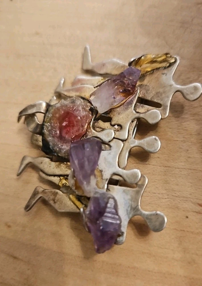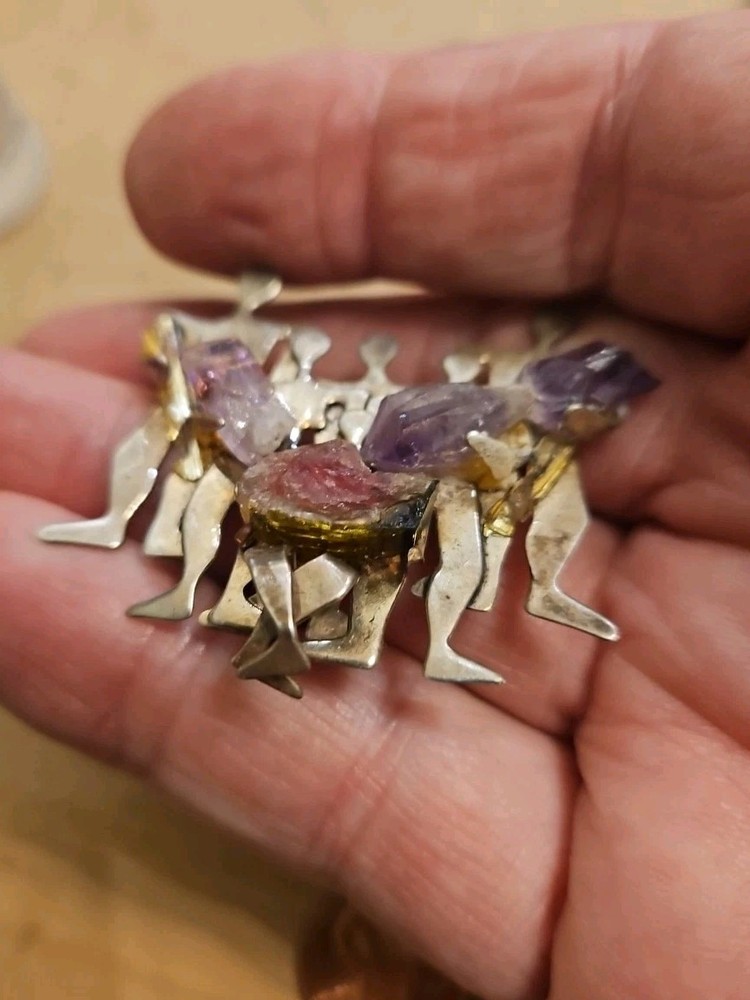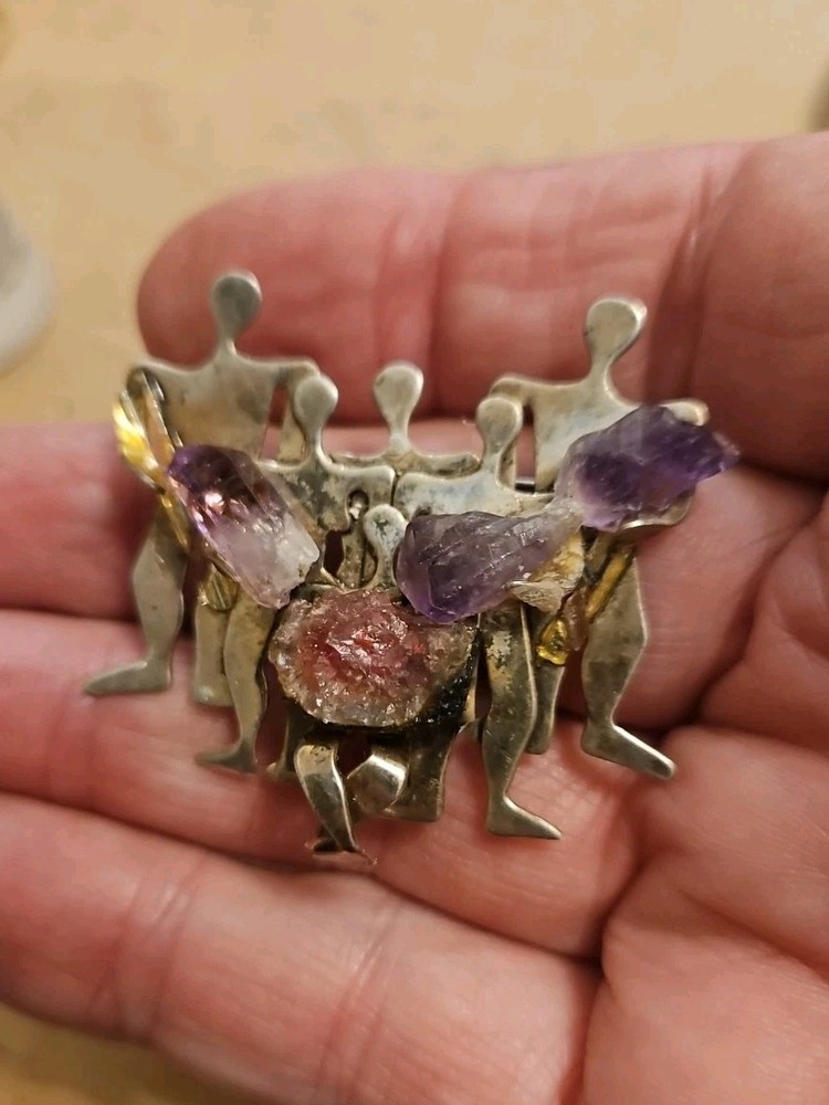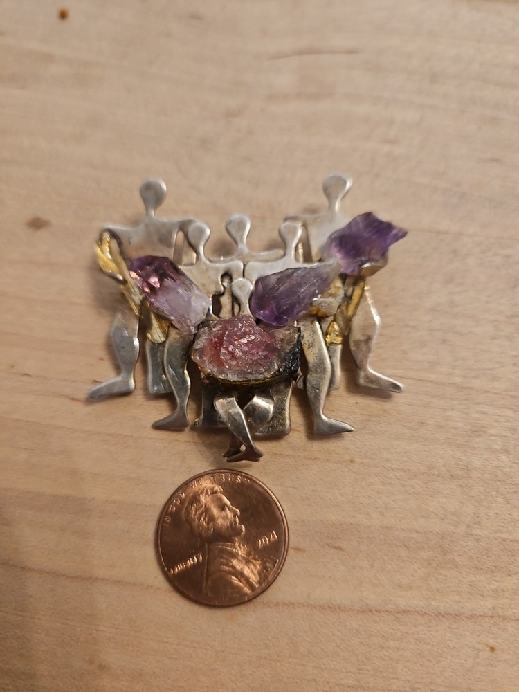 Color:SilverSecondary Stone:Citrine, Orange CalciteMetal Purity:925Item Length:2 InchesYear Manufactured:1980-1989Brand:IRINIRITheme:Family, PeopleMain Stone Treatment:UnknownCountry of Origin:IsraelType:BroochSetting Style:ProngSigned:YesBase Metal:Sterling SilverOriginal/Reproduction:OriginalNumber of Diamonds:0Number of Gemstones:4Main Stone Creation:NaturalAntique:NoDiamond Color Grade:noneShape:AsymmetricalCountry/Region of Manufacture:IsraelMain Stone Color:CitrineMetal:SilverVintage:YesMaterial:Sterling SilverMain Stone Shape:Rough StonesMain Stone:AmethystJewelry Department:FineDepartment:Unisex Adults