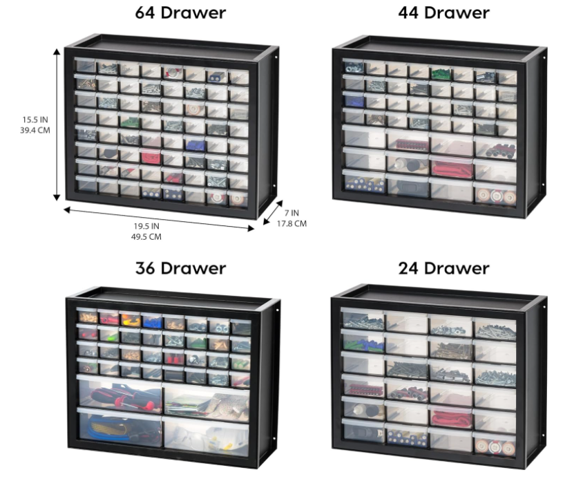 This IRIS organizer is a game-changer for keeping small parts tidy! The 24 drawers are sturdy and slide smoothly, making it easy to sort screws, bolts, craft supplies, or office essentials. The compact size fits neatly on a shelf or workbench, and the black plastic frame looks sleek while staying durable. Perfect for DIYers, crafters, or anyone who needs clutter-free storage—highly recommend!