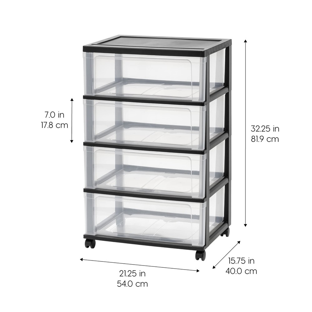 Tackle clutter and disorganization with the IRIS USA plastic wide drawer chest! This portable storage solution allows you to quickly access contents with the easy-pull drawers, and the built-in drawer-stops prevent the drawers from falling out when opened. Featuring removable caster wheels, you can use this drawer cart as an easy way to transport many things between rooms or create a more permanent, stationary storage solution for your space; the choice is yours! Thee drawers are perfect for everything, from clothing to linens, toys to craft and hobby supplies and more. Let's make life a little easier. FOR EVERY SPACE - The IRIS USA plastic storage drawer offers the perfect storage solution for any room in the house. Use it in the bedroom, dorm, office, or school to store all types of items. Large enough to fit a variety of items from clothes to supplies, it's perfect for maintaining clutter-free classrooms, art studios, living spaces and workspaces. SPACIOUS ORGANIZATION - Features easy-pull drawers for quick access so your items are always within reach. The clear, durable drawers allow you to see inside so that you can quickly identify stored items and save time searching. STURDY AND STABLE - The drawer stops help prevent drawers from falling out or being removed accidentally while the deep drawers provide plenty of storage space for your everyday items, optimize space usage, and help organize all of your rooms. The drawers are also made from quality materials to ensure long-lasting storage solutions. EASY MOBILITY - The four swivel wheels let you easily move the drawer when needed and allow for 360° rotation, or if you decide to keep the drawer unit in one place, you can remove the casters for a stationary storage drawer. GREAT SIZE - Dimensions: 15.75"L x 21.25"W x 33.81"H