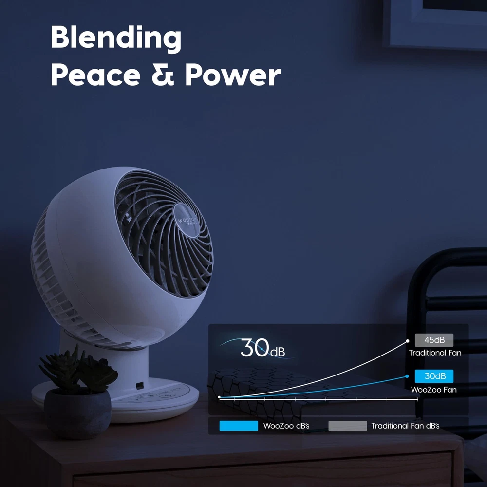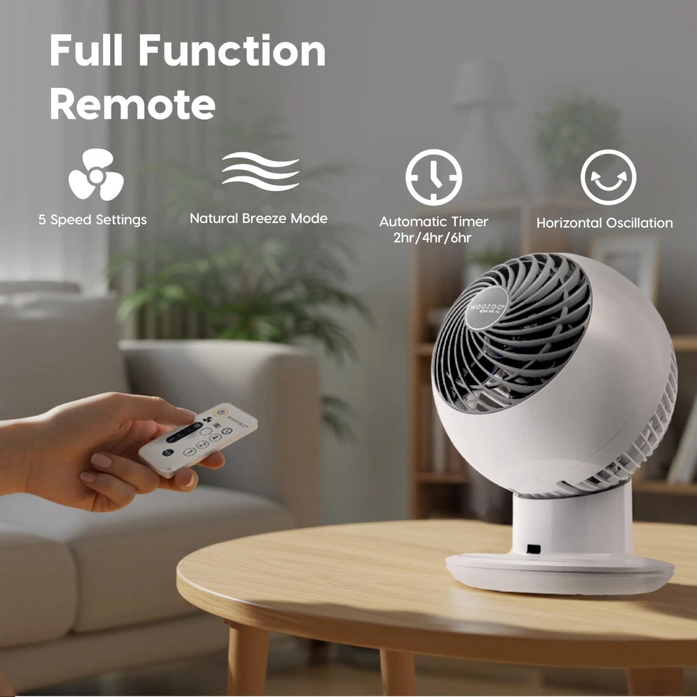 OSCILLATION – Achieve full room auto circulation like never before with WOOZOO oscillation. Set the fan to oscillate 65° to the left and right to ensure airflow reaches every corner of the room, and adjust the head to of six set angles. REMOTE - Change your settings without changing your seat. The remote gives you full control over the settings on your fan; switching the power on and off, changing the mode, changing the speed, auto-oscillation, and setting a timer. TIMER - Fall asleep to a cool breeze without leaving the fan on all night. With the timer function, you can set it to 1, 2, or 4 hours and the fan will shut off automatically, saving you money without having to sacrifice on comfort. QUIET - Emitting only 30 dB of noise, the WOOZOO circulator is perfect for when you need a breeze while trying to sleep or study, or just want to be cool and relax without any loud noises or distractions. GREAT SIZE – The small desktop fan is lightweight and portable. Allows you to move your circulator fan easily from room to another. Dimensions: 8.27"L x 8.27"W x 11.42"H, fits neatly on desks, countertops, and nightstands.