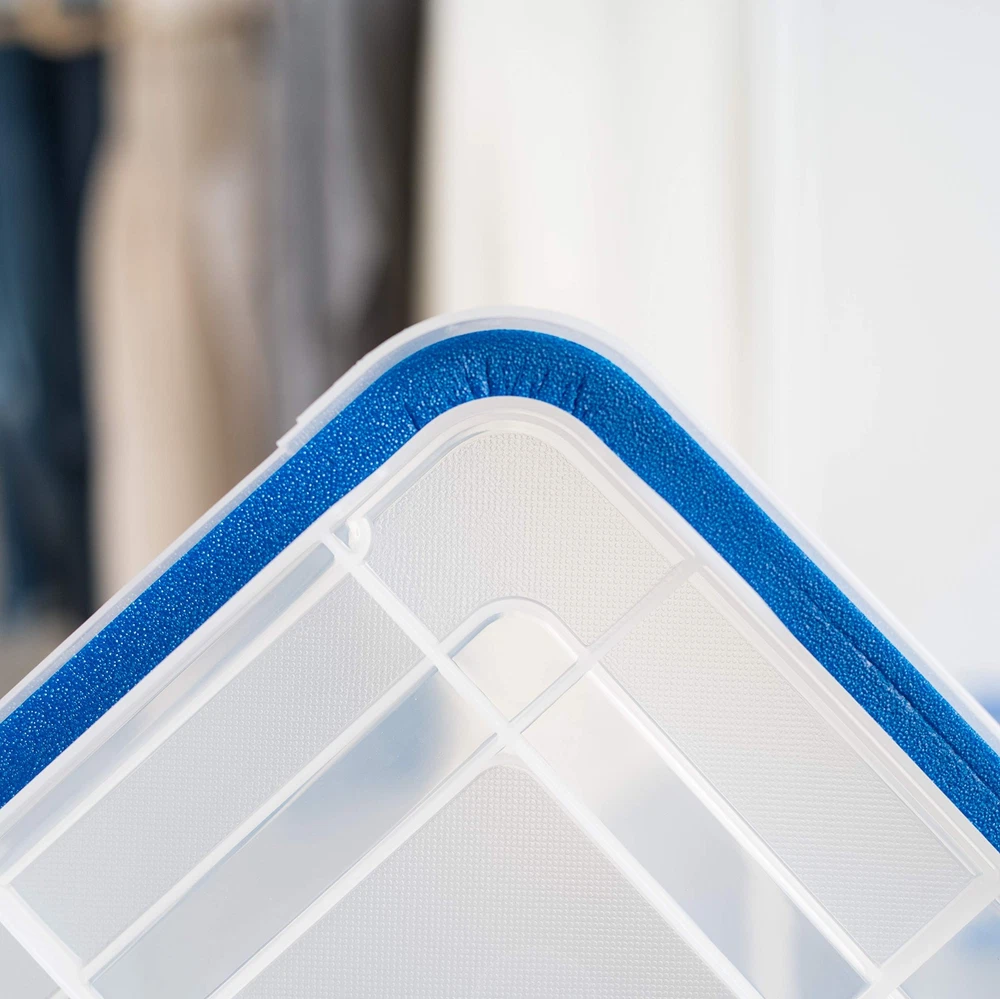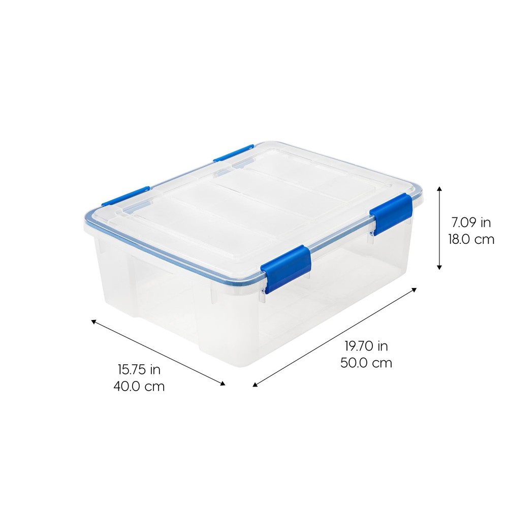MADE IN USA: Quality you can trust! Our storage bins are proudly crafted in the USA using high-quality, durable materials, ensuring your belongings stay safe and secure. WEATHERPRO GASKET SEAL: These bins feature top-notch seals in the lid that create a vacuum-like environment to lock out moisture, dust, and more. Keep your belongings fresh and safe! TIGHT BUCKLE-UP LATCHES: The multi-buckle latching system ensures a tight and secure fit. Ideal for storing all sorts of items like documents, food, clothes, camping and hunting gear, etc. STACKABLE DESIGN: The grooved lid and body allow for easy, secure stacking, making it a breeze to store and transport your items in your home or vehicle. Save space and stay organized! BPA-FREE AND ACID-FREE: The material used is safe for storing items, as it's free from harmful chemicals like BPA, acids and phthalates. TAPERED DESIGN: Easily nest them when not in use -- DIMENSIONS: 19.55"L x 15.56"W x 7.99"H -- INSIDE DIMENSIONS: 17"L x 13.5"W x 6.13"H