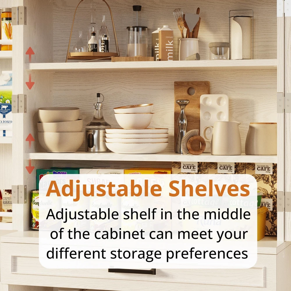 Versatile Pantry: This farmhouse kitchen pantry is versatile and suitable for most rooms in the home. Clean lines and smooth surfaces allow the cabinet to match any furniture style. Door Storage Racks: The cabinet comes with 6 door racks, which can be designed with customized space for small kitchen items such as spice jars, canned goods, and olives to maximize the use of cabinet space. Sliding Storage Racks: The cabinet comes with 3 sliding racks, which can be used flexibly for various items. Large-capacity kitchen cabinets can keep your kitchen clean and tidy. No matter where you put it, you can organize it. Sturdy and Durable: Made of high-quality medium-density fiberboard, ensuring strength and durability. The included anti-tip kit helps to secure the cabinet to the wall, ensuring the safety of you and your family. Easy to Assemble: All hardware and clear assembly instructions are included in the package, and professional installation guidance is also provided, so there is no need to worry about assembly.