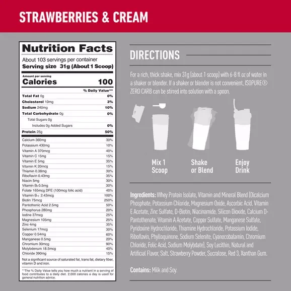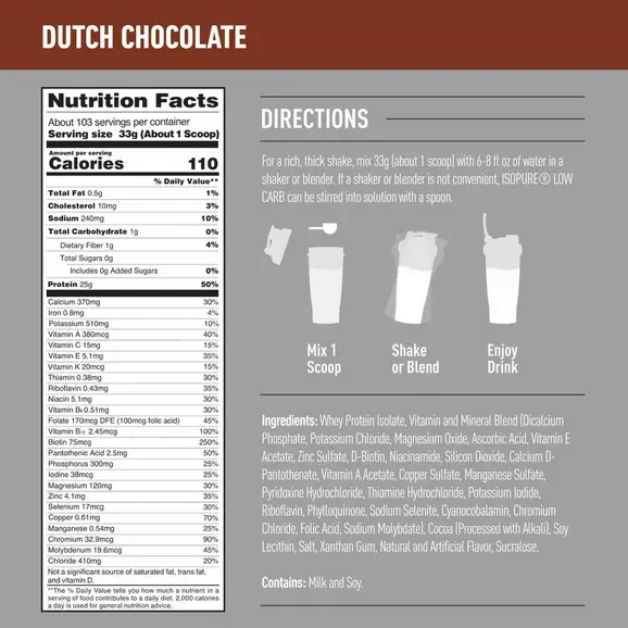 Product Overview Zero Carb/Low Carb Protein Pack in high-quality protein, without packing on the carbs. Just pick your level: Zero Carb or Low-Carb (which also has ZERO sugar), both with 25 grams of 100% pure whey protein isolate per scoop and added vitamins and minerals—to help you perform at your peak. It’s made with naturally occurring and added glutamine—and always without gluten, lactose or fillers. Available in a wide range of flavors so you can mix up some seriously tasty and dynamic recipes. Benefits Supports muscle building and recovery Helps meet daily protein needs Weight management support Supports muscle health as we age Suggested Use WHEN TO CONSUME? Post workout or other strenuous activity First thing in the morning Between meals HOW TO CONSUME? Mix 1 scoop with 6 fluid ounces of water, milk or your favorite beverage in a shaker or blender.