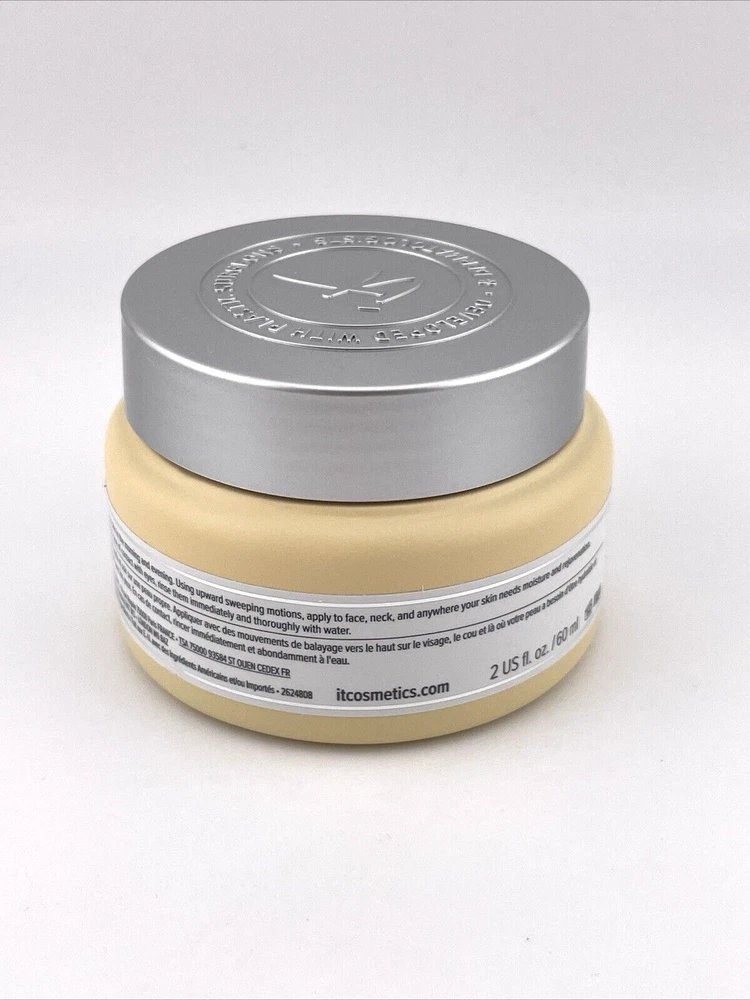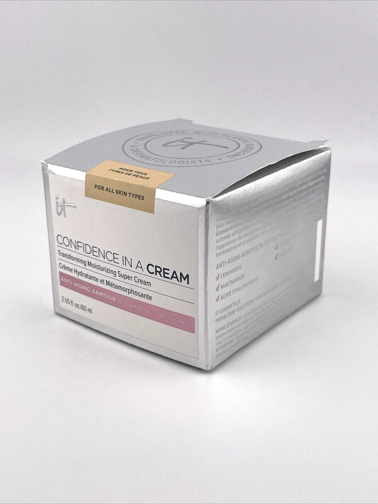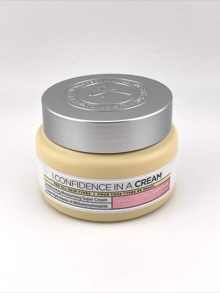 T Cosmetics Confidence In A Cream Anti-Aging Armour - 2 oz Condition : Brand New, Sealed Product Overview : IT Cosmetics Confidence In A Cream Anti-Aging Armour is a multi-tasking moisturizer that works to improve the look of skin’s firmness, elasticity, and radiance while delivering long-lasting hydration. This anti-aging moisturizer is formulated with a blend of powerful ingredients to provide a boost in skin’s moisture while visibly reducing the appearance of fine lines and wrinkles. Key Benefits : Reduces the look of fine lines, wrinkles, and pores Visibly firms and lifts the skin Delivers intense hydration for soft, supple skin Promotes a brighter, more even complexion Key Ingredients : Collagen : Helps improve skin elasticity and firmness Peptides : Support natural collagen production to reduce the look of wrinkles Hyaluronic Acid : Provides deep hydration, plumping the skin Antioxidants : Protect the skin from environmental stressors Ceramides : Strengthen and restore the skin’s moisture barrier Size : 2 oz / 60 ml (Perfect for travel or daily use) How to Use : Apply to clean skin in the morning and evening. Smooth gently onto face, neck, and décolleté using upward motions. Perfect for : Ideal for those looking for a potent anti-aging moisturizer that provides hydration and targets multiple signs of aging, including wrinkles and skin firmness. This IT Cosmetics Confidence In A Cream Anti-Aging Armour in a 2 oz jar is a great addition to your skincare routine for maintaining youthful, hydrated skin.